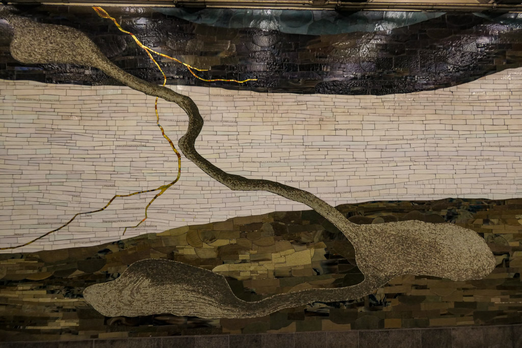 11. Кстати, при современных реконструкциях старых остановок, власти стараются сохранить некоторые традиции. Например, много где появляется новая декоративная мозаика. Стены перехода на заглавной картинке этого поста, стилизованы под землю, показанную в разрезе. По ним ползут мозаечные корни. Вот кульминация этого рисунка: