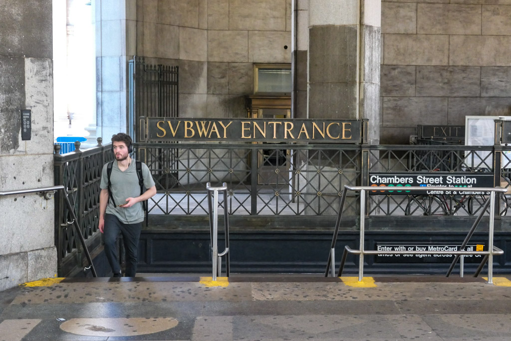 3. Именно здесь находится вход на станцию метро Chambers Street. Посмотрите на эту вывеску: здесь вместо слова "SUBWAY" написано "SVBWAY". Это стилизация под старину. Знаете, как в русском языке иногда добавляют к концу слова твёрдый знак, чтоб имитировать дореволюционную грамоту? Вот нечто похожее имело место и в Америке начала ХХ века - только тут отсылка к более древним грамматическим нормам: в латинском алфавите Древнего Рима не было буквы "U", вместо неё всегда писалась "V". И вот, в ранние 1900е, была среди фанатов неоклассицизма мода так же выпендриваться. Поэтому и "SVBWAY".