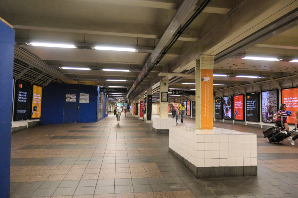 18. Этот неуютный и странный переход изначально задумывался как станция - эти странные тумбы были платформой, а между ними проходили пути. Но потом, когда систему объединяли, и маршруты оптимизировали, сделали тут проход для людей.