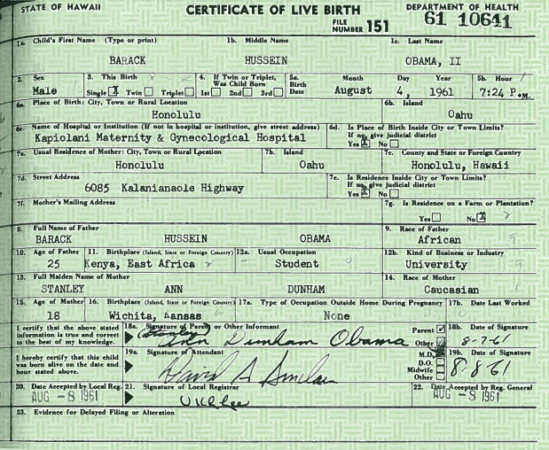 Этот документ выдали маме Барака Обамы на Гавайях. Тут есть специальная графа (6b) "Island", отмечающая, на каком и Гавайских островов родился ребёнок.