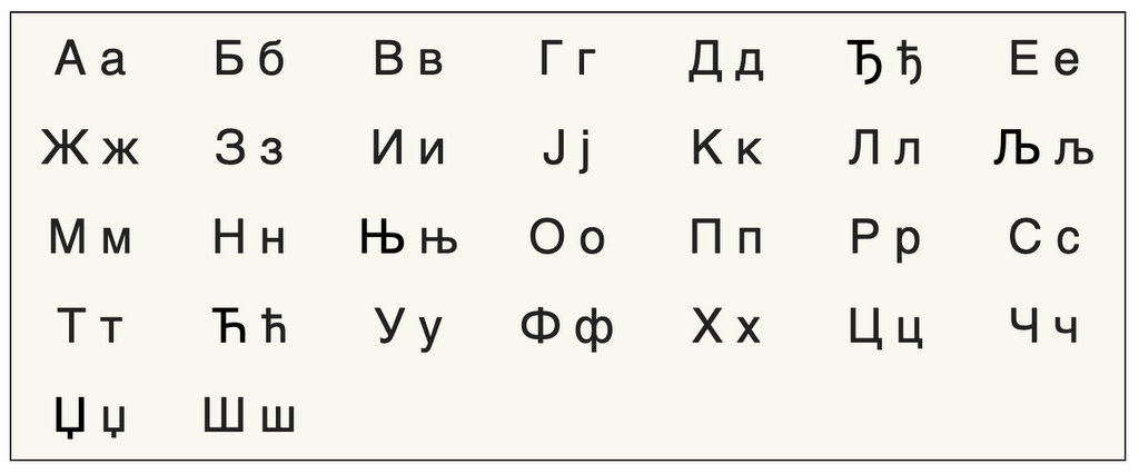 В его алфавите 30 букв: 24 из них взяты прямиком из обычной кириллицы. Одна ("J") - пришла из латиницы. И ещё пять букв Вук придумал сам, специально для сербского языка.