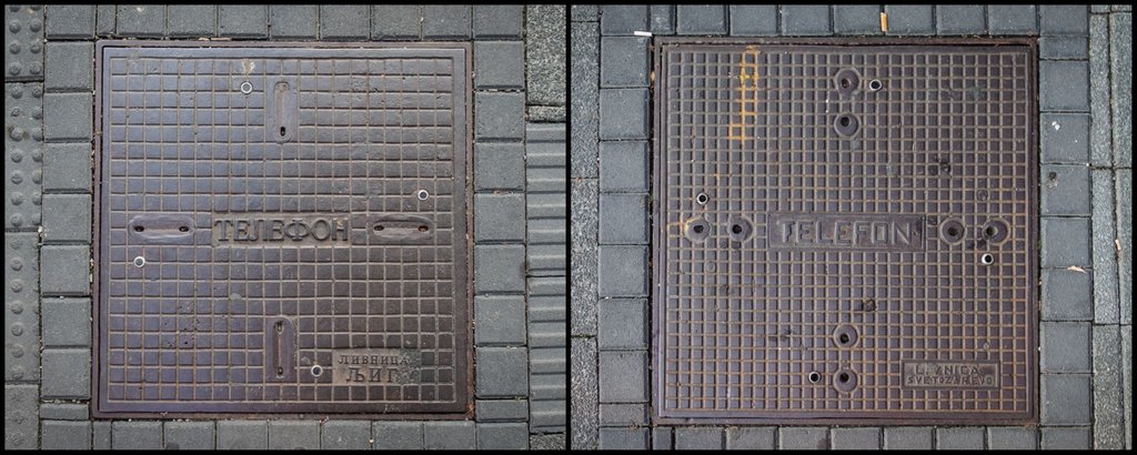10. Или вот: эти два телефонных люка расположены на тротуаре буквально в метре друг от друга. Однако один - Телефон, а другой - Telefon.