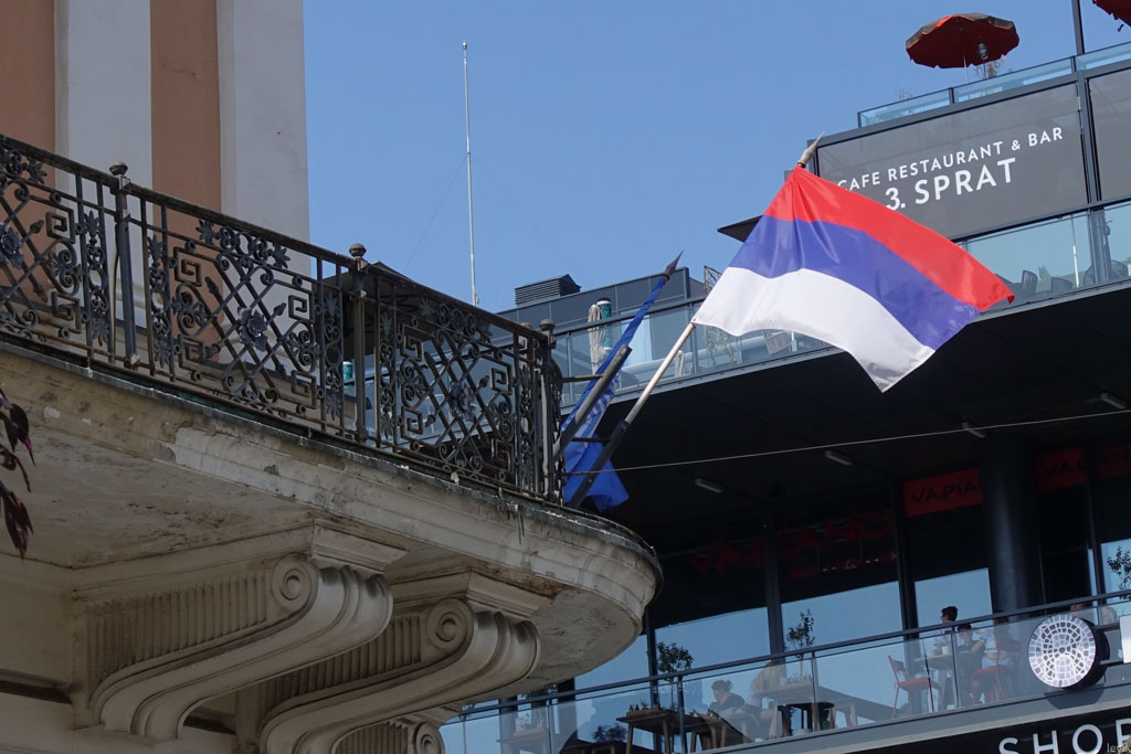 Признаюсь, за первый день в Сербии открыл для себя много нового. Я всегда по глупости своей думал, что Сербия очень многим схожа с Россией: флагом, языком, кириллицей. Как обычно бывает, при ближайшем изучении оказалось, что всё не так просто. Например, недалеко от гостиницы я увидел вот такой флаг: