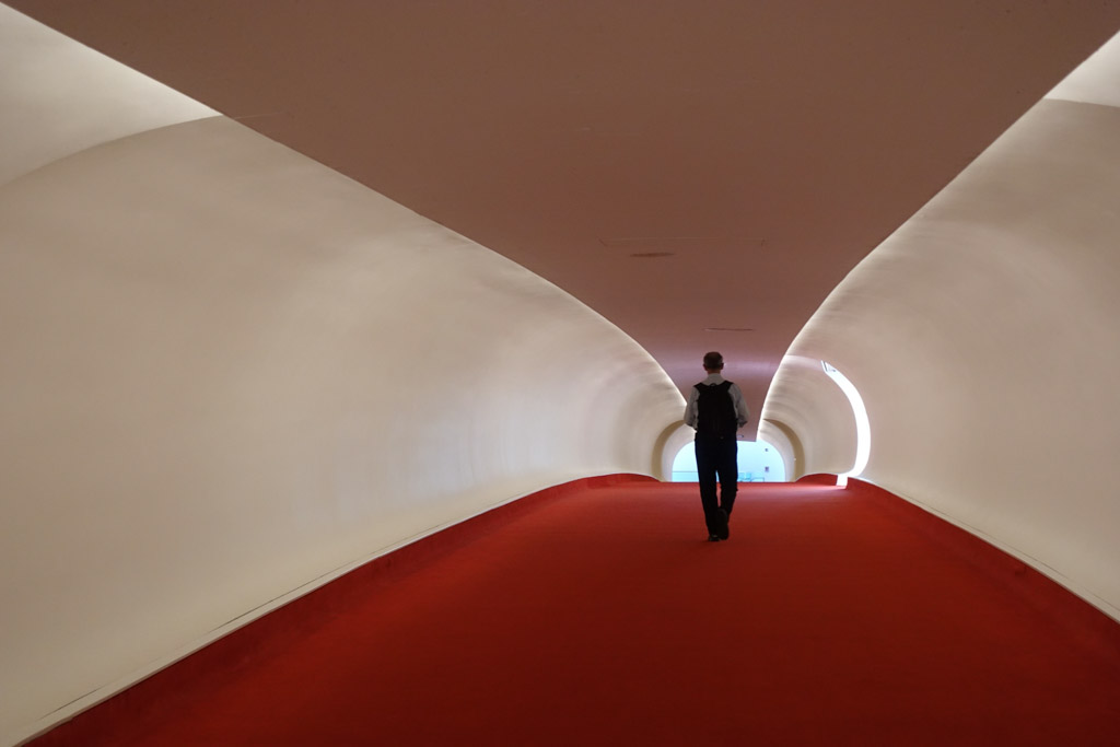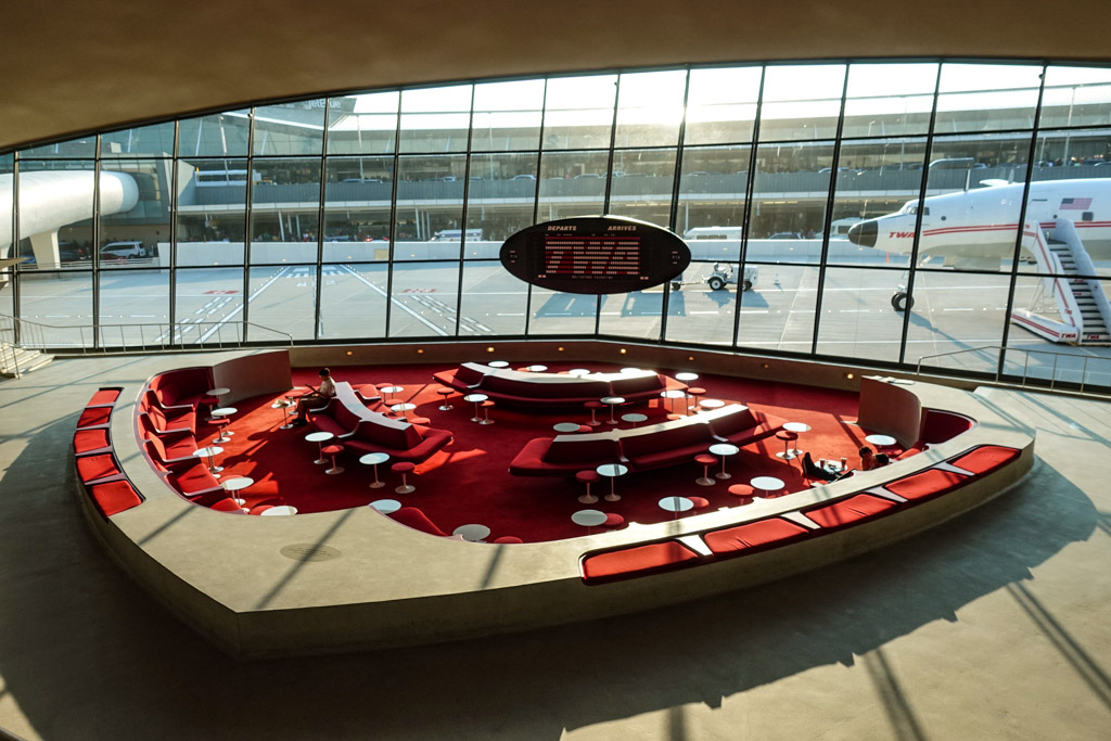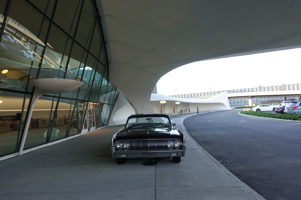 Но не волнуйтесь. Я вам всё объясню. Просто приезжаете в пятый терминал JFK (отсюда летает JetBlue), и спускаетесь на самый нижний уровень (невзрачные Arrivals). Отсюда в TWA Hotel ведёт специальный лифт. Поднимаетесь по нему, и по специальному переходу отправляетесь в золотой век авиации, 1960-е.
