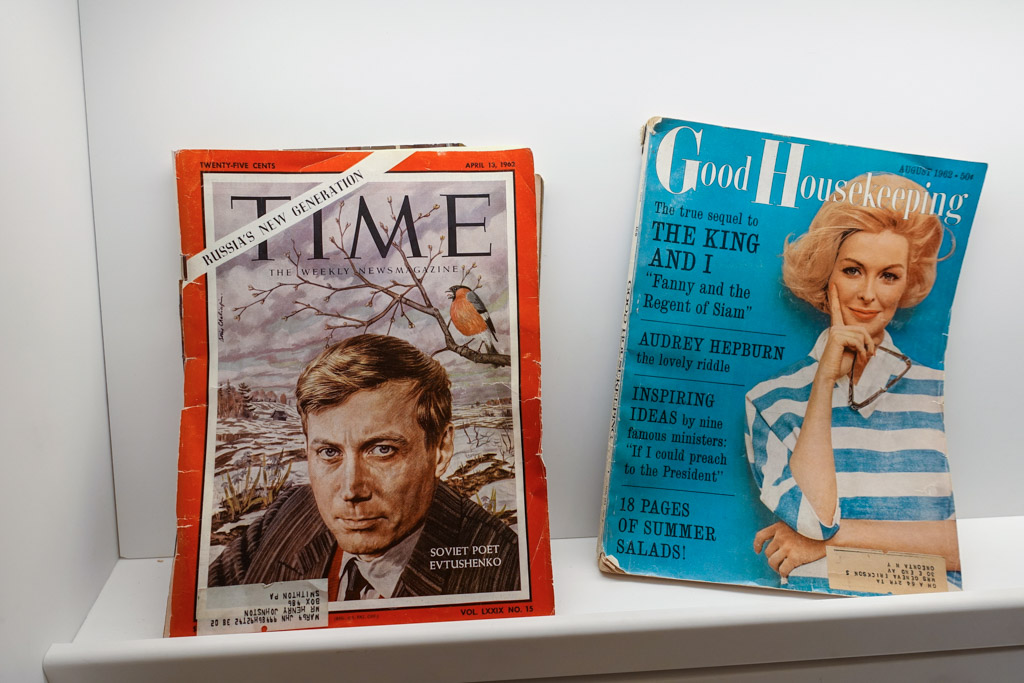 7. В "киоске" отельного лобби появились газеты и журналы 1960х. Например, вы знали, что в шестьдесят втором году на обложке журнала Time появился советский поэт Евгений Евтушенко?