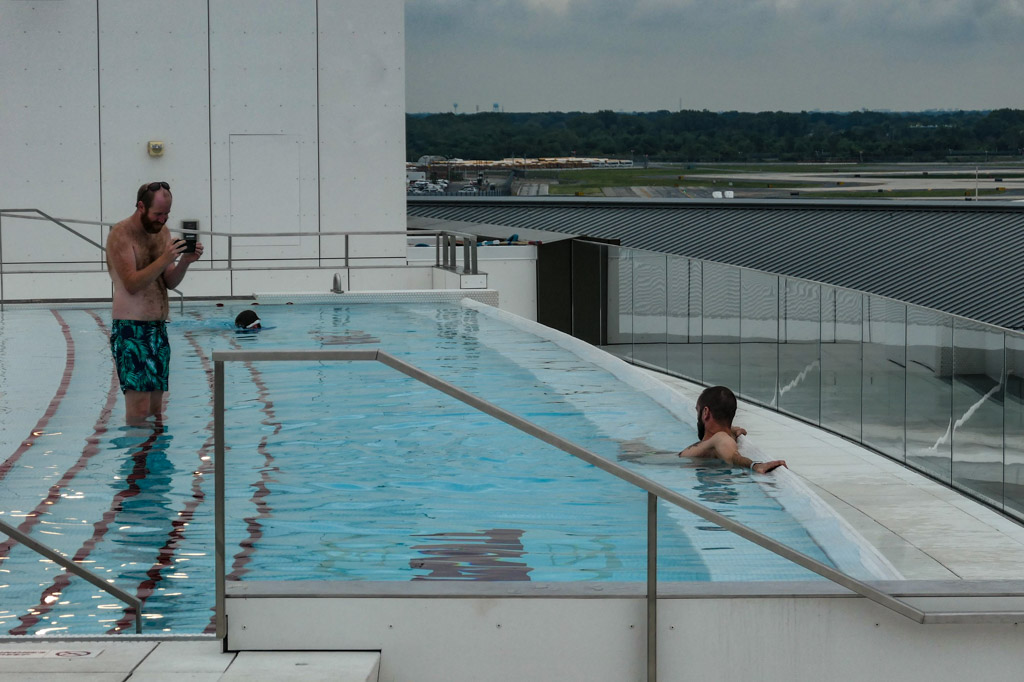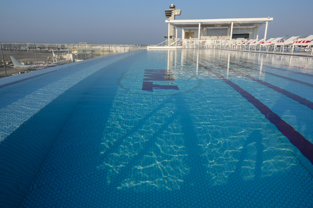 Бассейн находится на крыше одного из гостиничных корпусов, которые построили рядом со старым терминалом. Это один из таких infinity бассейнов, где не вроде как не видно края.