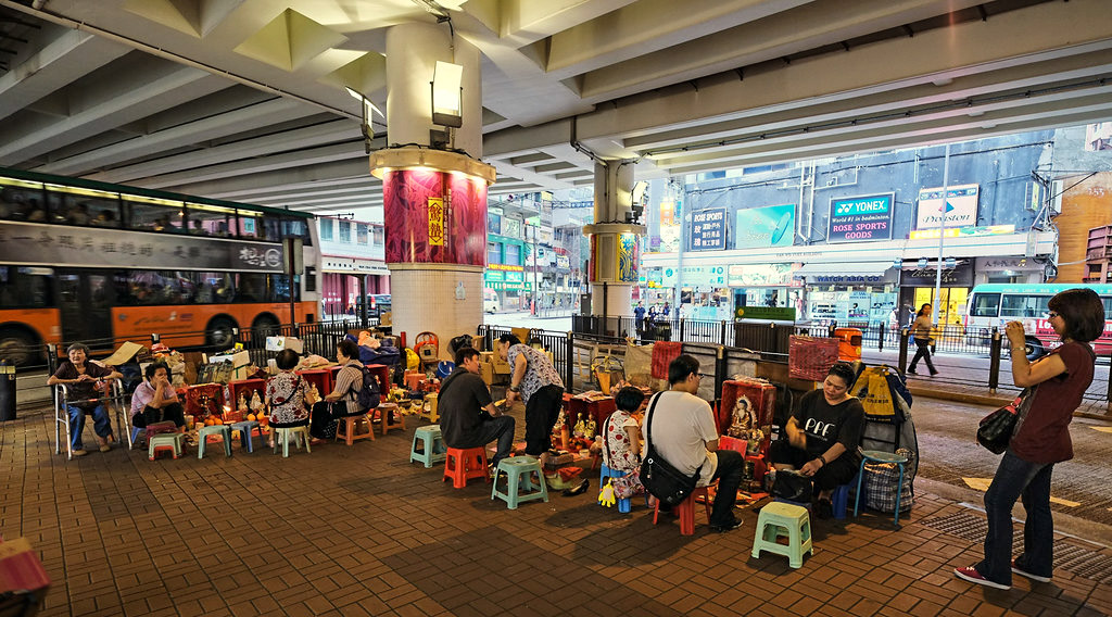 — Отлично! Сейчас покажу тебе одну очень известную бабушку, — сказал Пазу. Мы свернули с главной улицы Hennessy Road, по которой ходят двухэтажные гонконгские трамваи, и нырнули под эстакаду Canal Road. Там как раз было такое место, где эстакада только начинает подниматься вверх, и ещё довольно низко нависает над головами прохожих.
