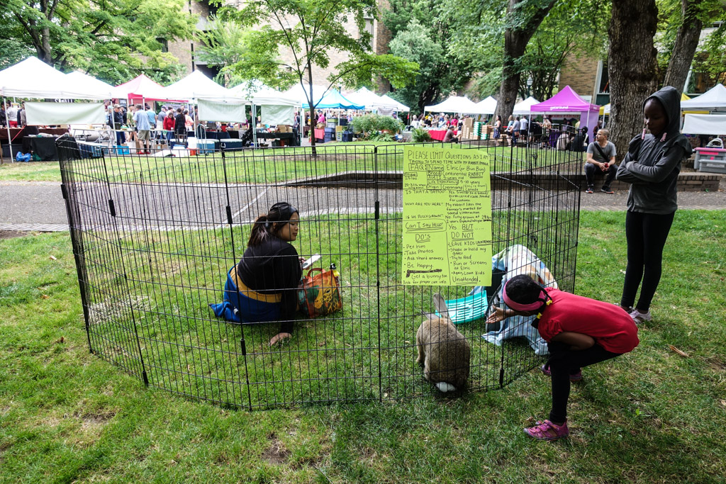 18. Но, довольно о грустном. Ведь Причудливый Портленд, это не только бомжи и наркотики! Прогуливаясь в местом парке, мы набрели на вот такой временный загончик на траве. Внутри сидела девушка, которая таким образом выгуливает своего кролика.