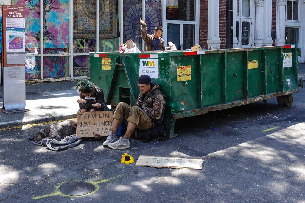 5. Эта парочка попрошайничает возле помойки. На табличке написано, что они странствующие бродяги. "Anything helps. Dog bless" - тут игра слов, вместо "God bless", они предлагают благословление своей собаки.