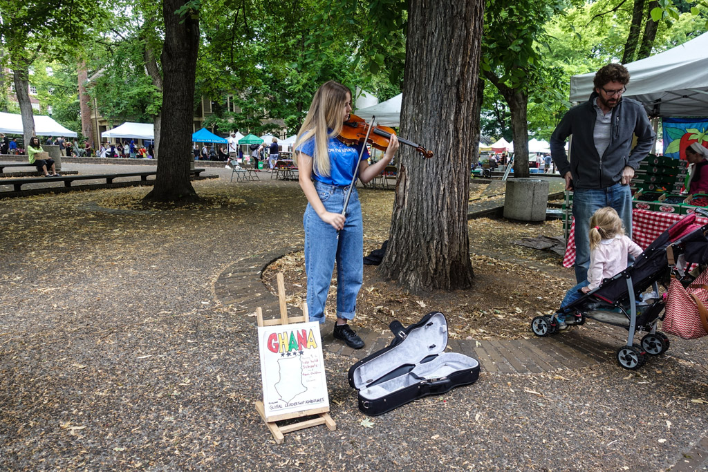 22. Недалеко от этой милой сцены стоит девушка, и играет на скрипке. Она собирает деньги на гуманитарную поездку в Гану.