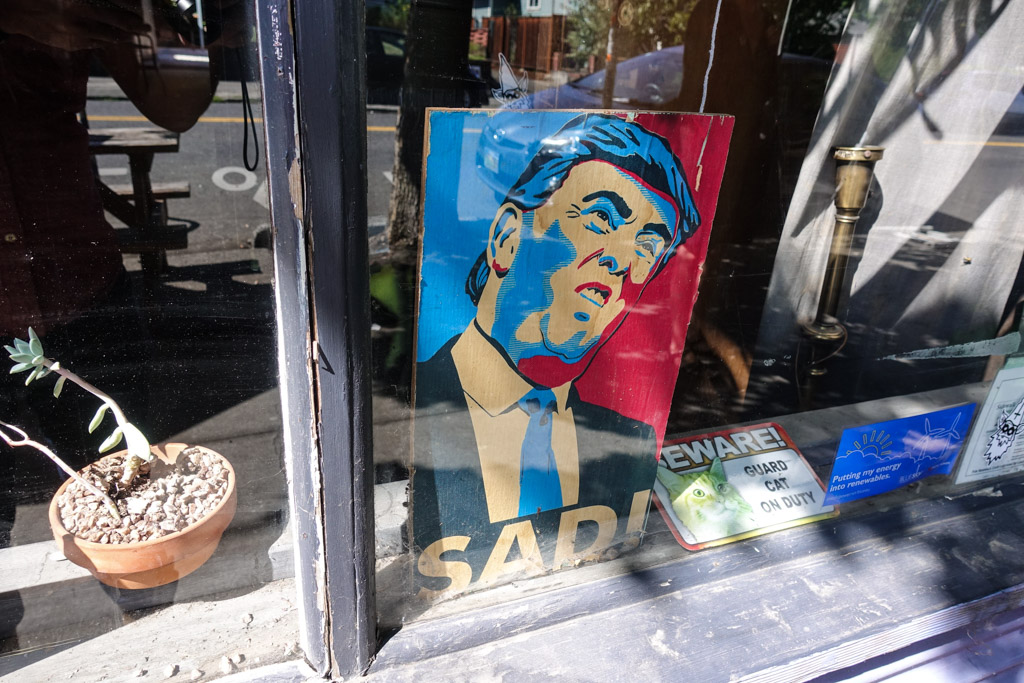 25. Бабушка в смешной шапочке агитирует за Берни Сандерса. Портленд - город либеральный, здесь поддерживают демократов. За пару дней я видел агитацию за нескольких демократических кандидатов в президенты.