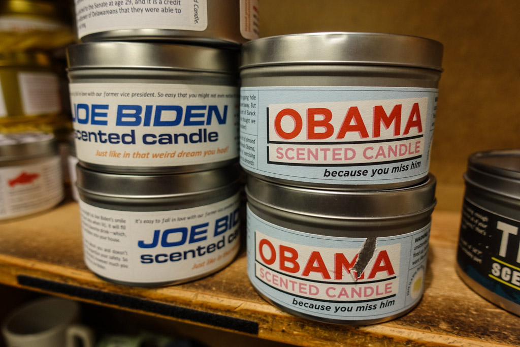 28. Правда, рядом на полке продаются и обамовские свечки. Снизу мелким шрифтом написано: "Потому что вы по нему уже соскучились"