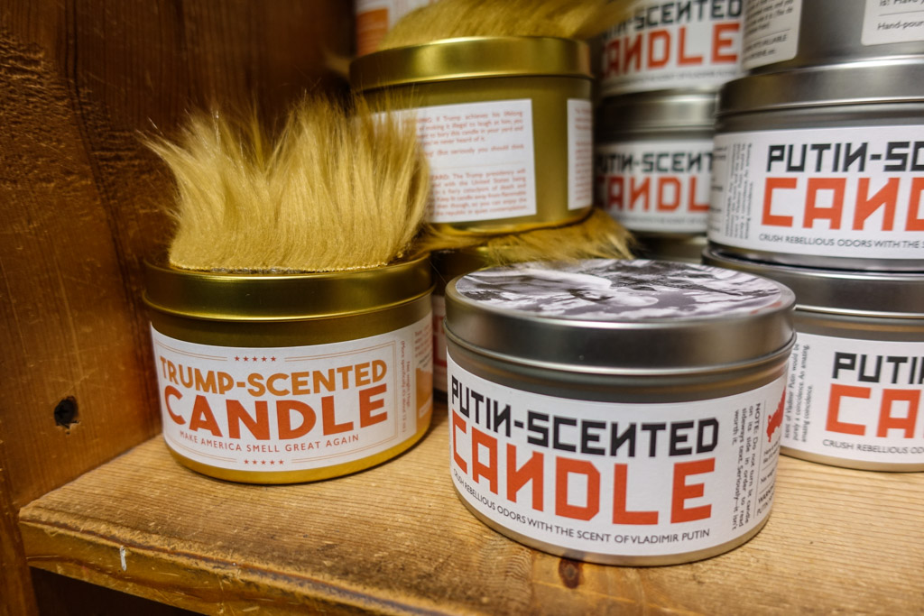 27. В местном книжном магазине продаются свечи "с запахом Трампа" (с жёлтыми волосами на упаковке). Рядом на полке - свеча с запахом Путина. Это напомнило мне "трамповские" сувениры в аэропорту Лос-Анджелеса.