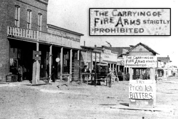 Так и со Второй Поправкой. На протяжении американской истории было немало мест, где запрещалось хранение оружия. Вас это возможно удивит, но многие поселения Дикого Запада первым делом принимали законы о запрете на оружие в городской черте. Да, да! Многие из этих пыльных городков из фильмов-вестернов, где кино-ковбои вели постоянные перестрелки с кино-бандитами, на самом деле не разрешали носить оружие! Приезжий должен был первым делом сдать пистолет шерифу, и мог получить его только когда уезжал из города.
