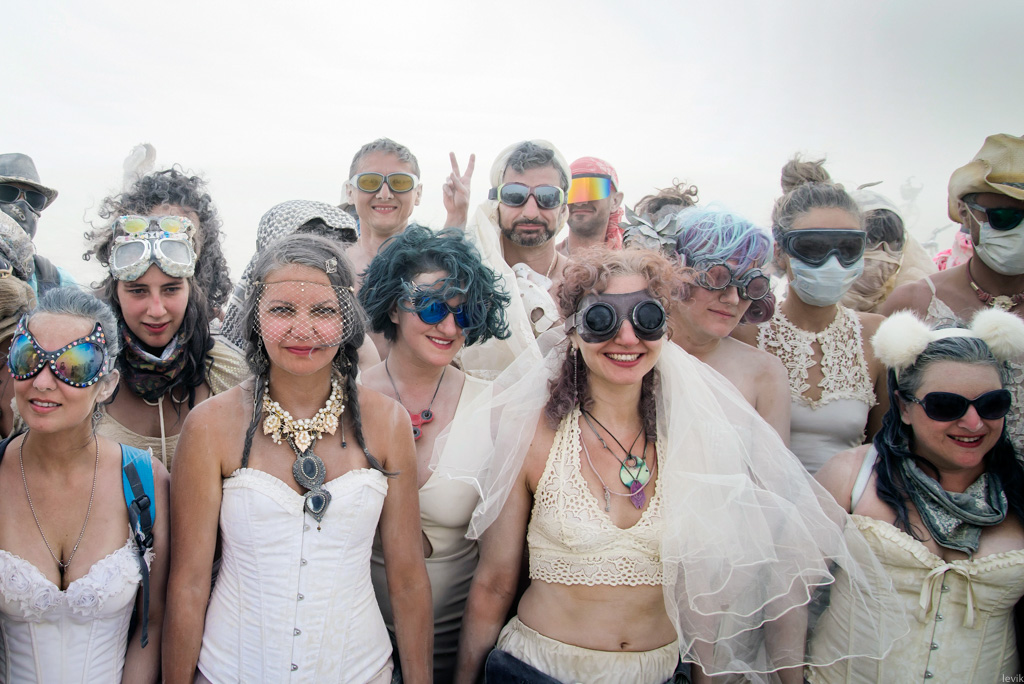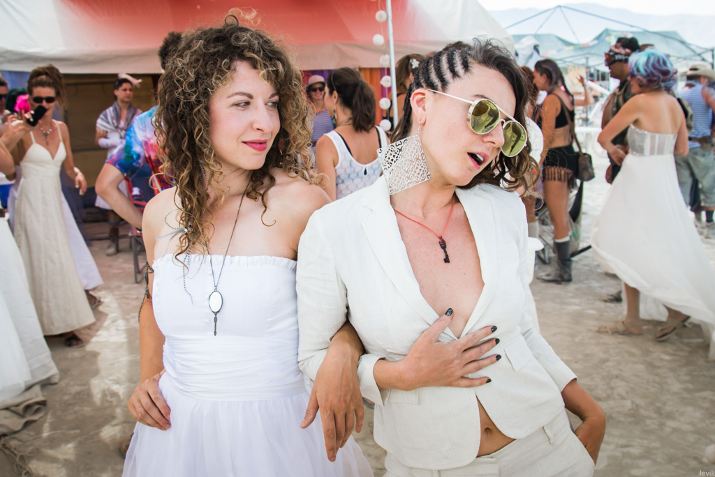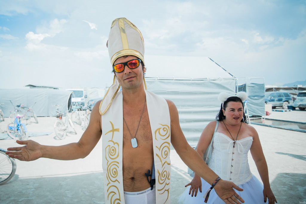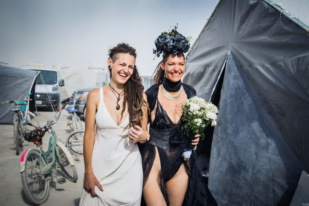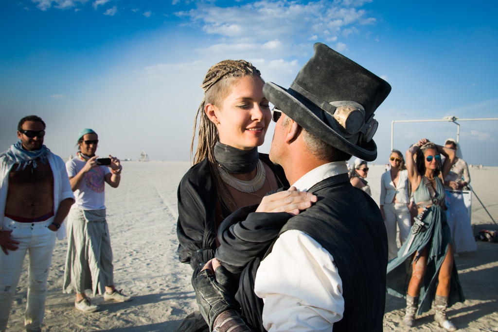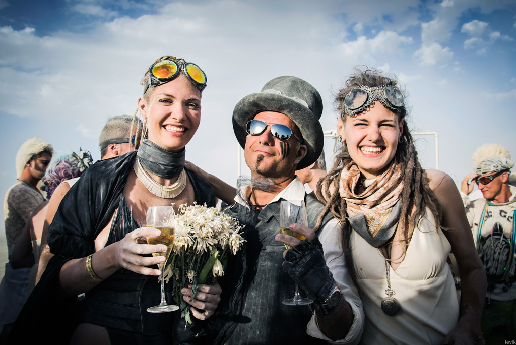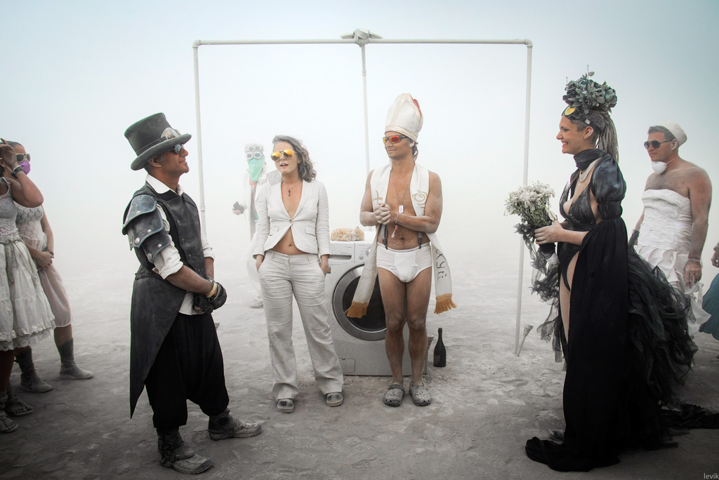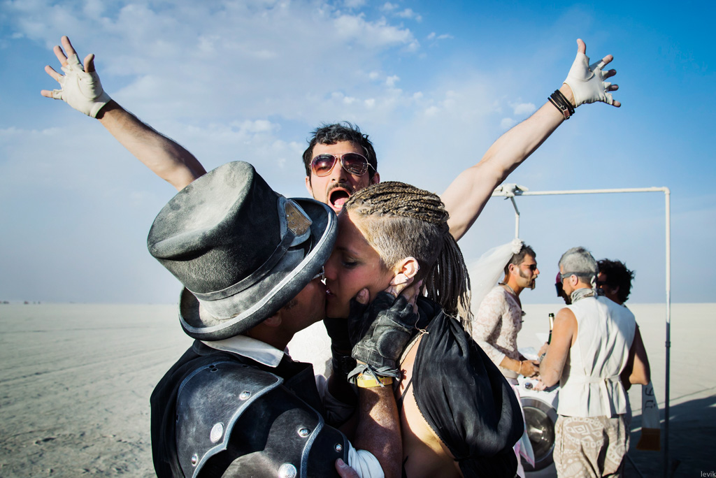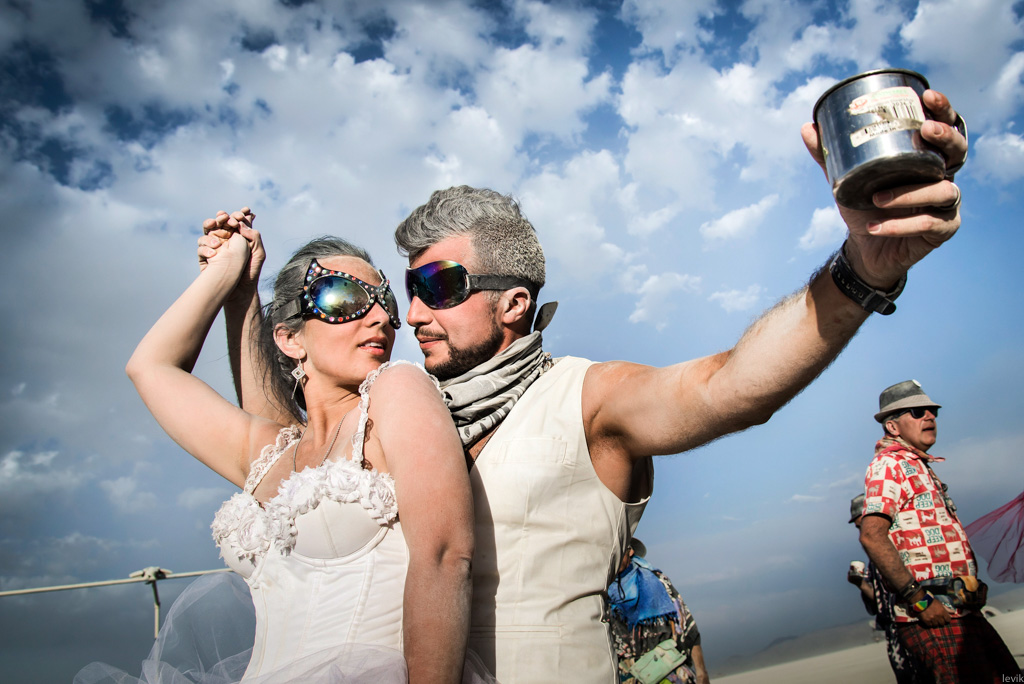 Не смотрите, что они так неформально выглядят (это же Burning Man!) Эти двое – успешные партнёры-адвокаты, ведут многолетнюю практику. Их фотографии даже можно увидеть на боках нью-йоркских автобусов. Короче, самые что ни на есть респектабельные личности, если вам вдруг приспичило жениться посреди невадской пустыни.