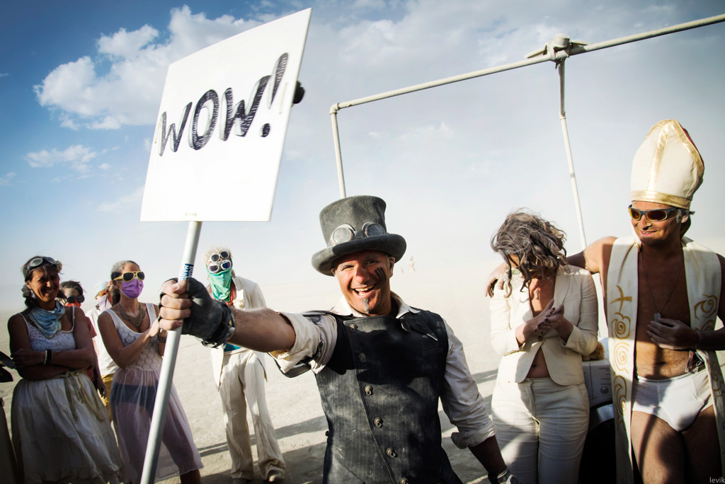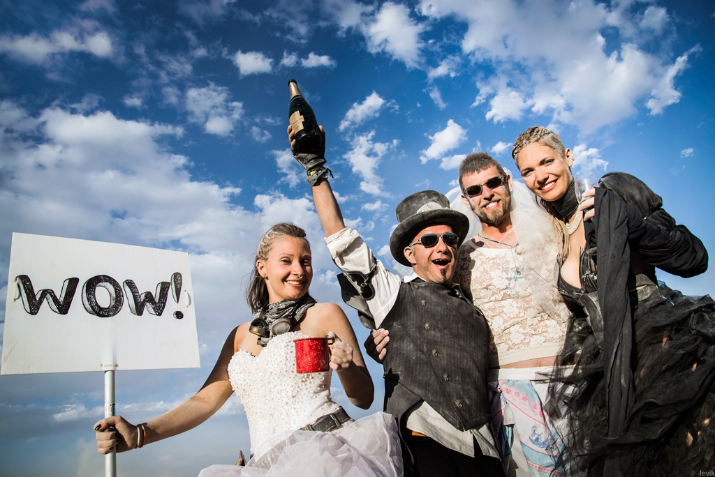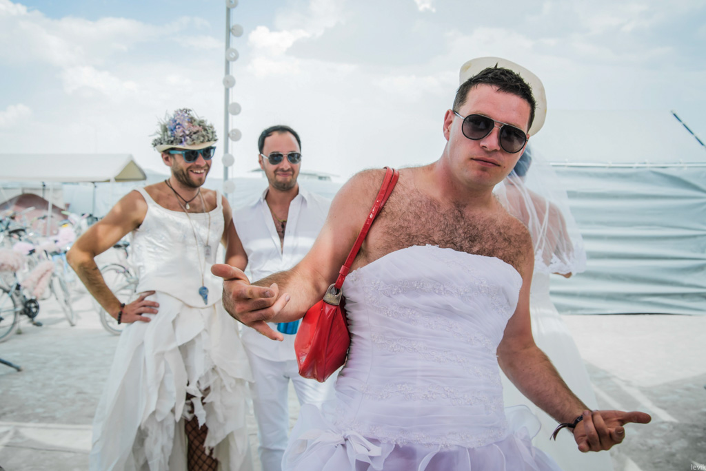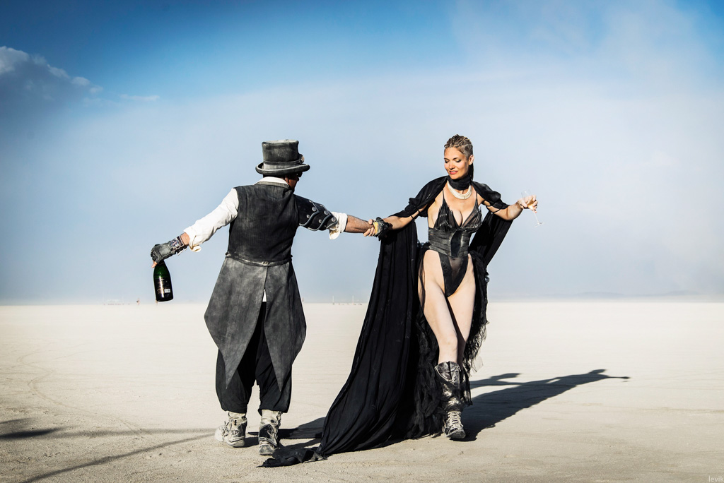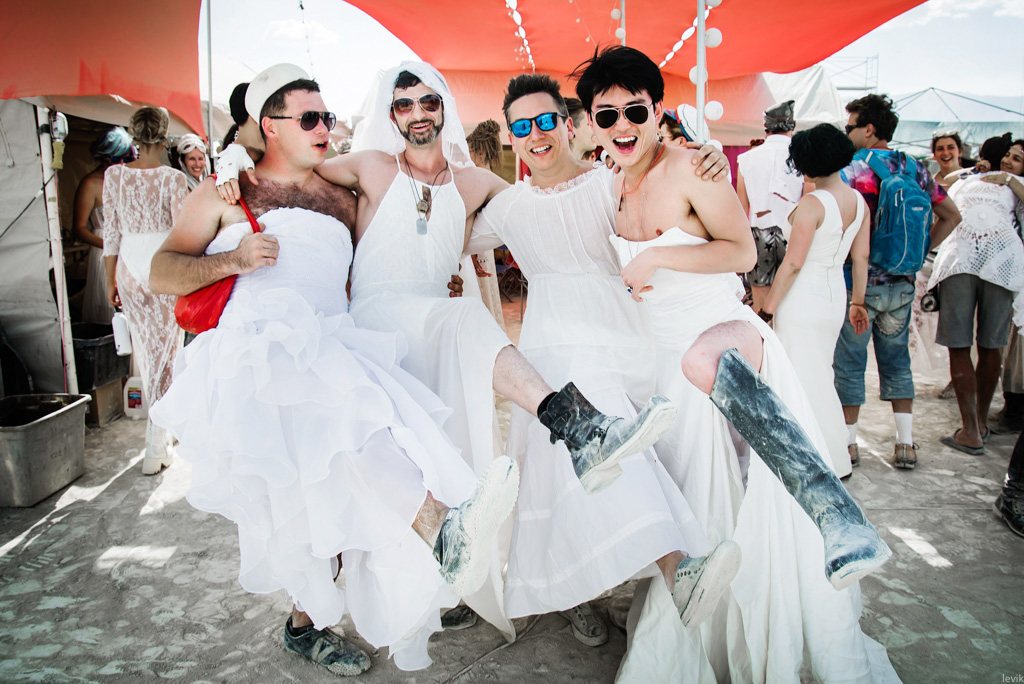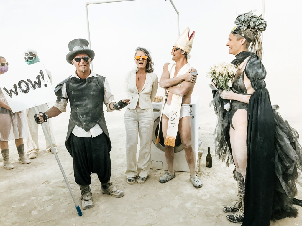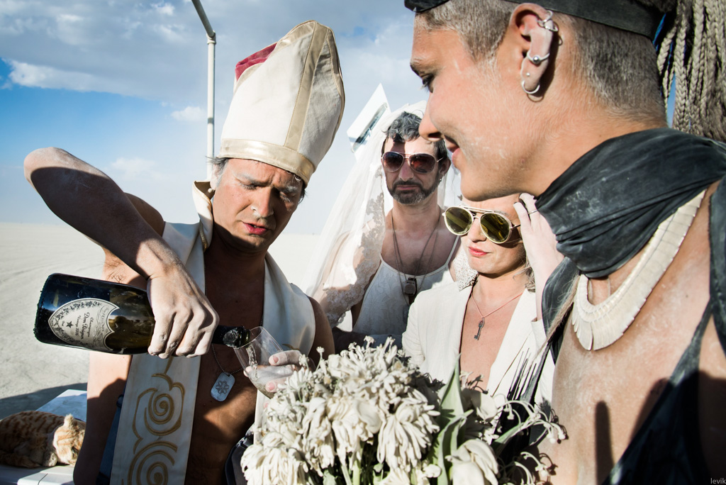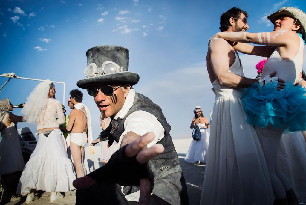 Не смотрите, что они так неформально выглядят (это же Burning Man!) Эти двое – успешные партнёры-адвокаты, ведут многолетнюю практику. Их фотографии даже можно увидеть на боках нью-йоркских автобусов. Короче, самые что ни на есть респектабельные личности, если вам вдруг приспичило жениться посреди невадской пустыни.