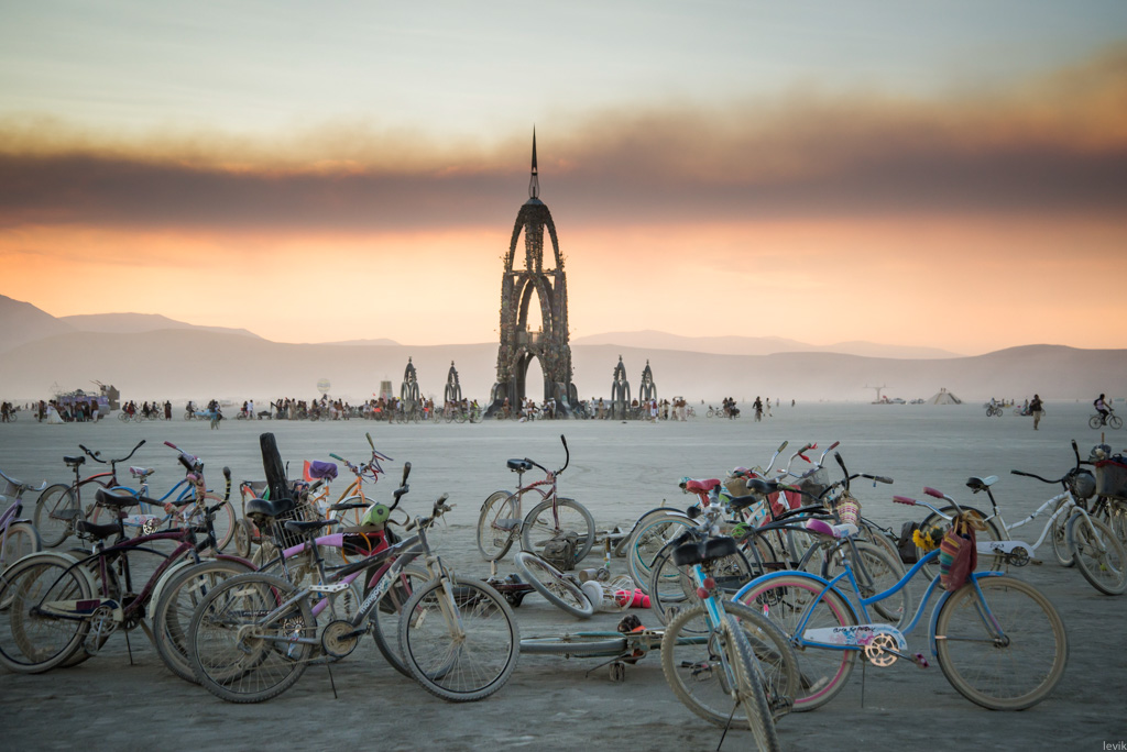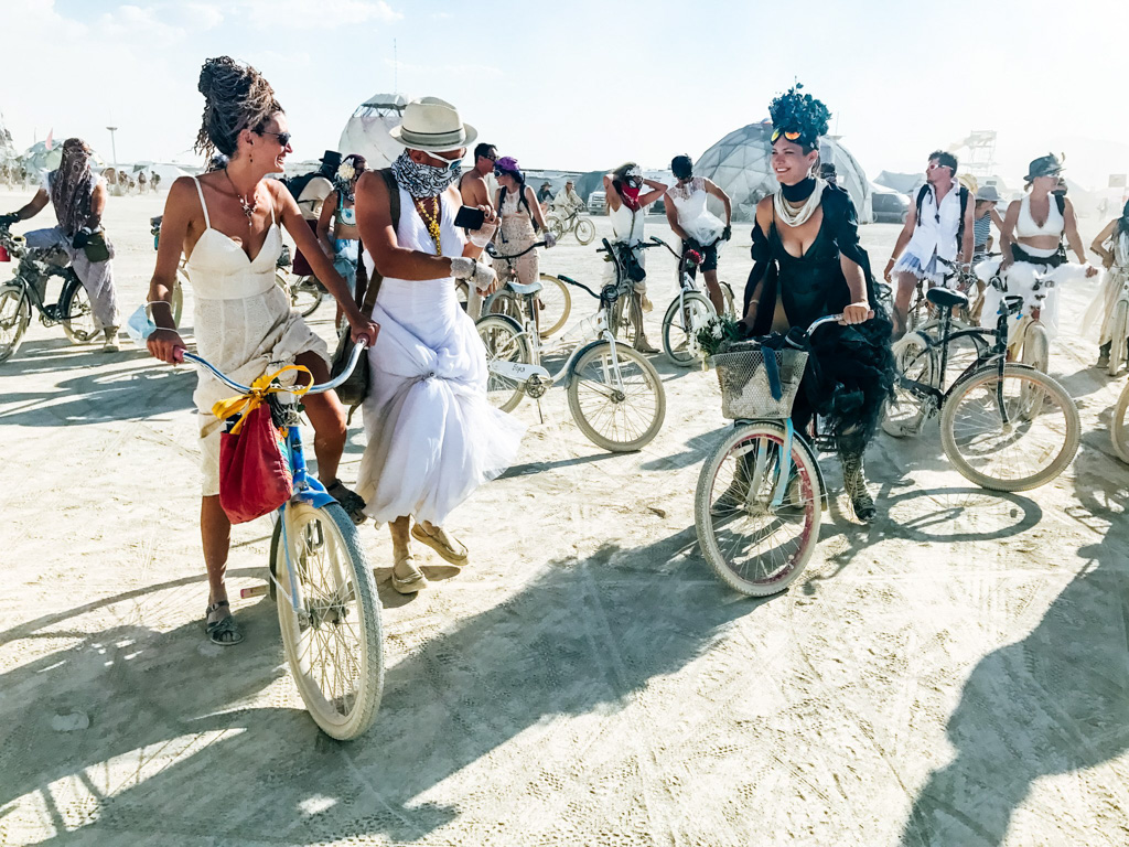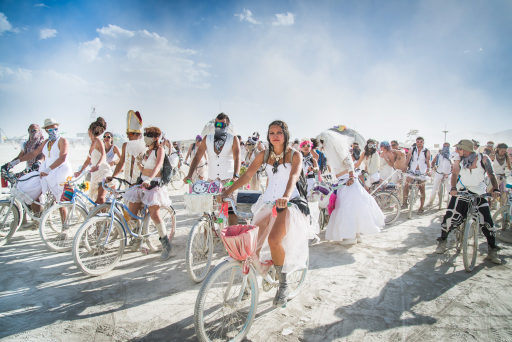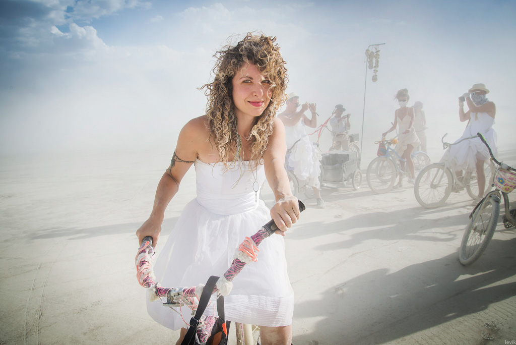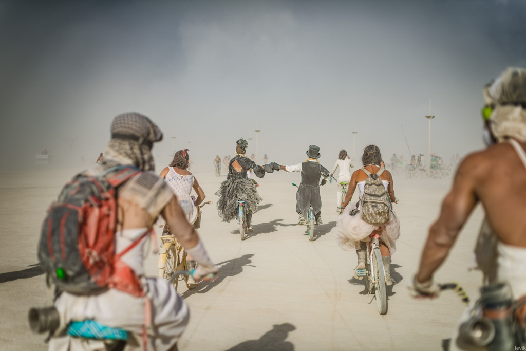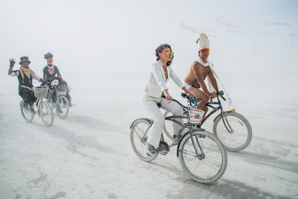 16. Нам пора было ехать на церемонию, которая, как мы решили, будет проходить в открытой пустыне. В открытую пустыню людей не позовёшь, так что мы пригласили всех собраться в лагере. А теперь предстояло сесть на велосипеды, и свадебной велопроцессией проехать к месту, где нас поженят. Велосипеды - главный способ передвижения на Бёрнинг Мэне. Но собрать всех гостей оказалось делом нелёгким. Не все были на великах.