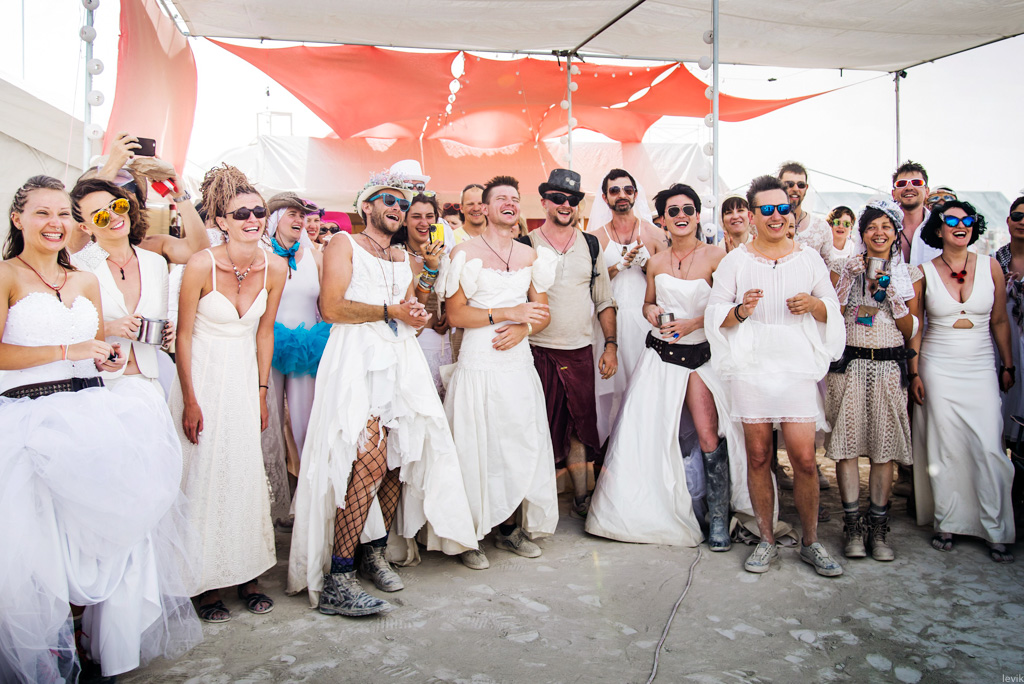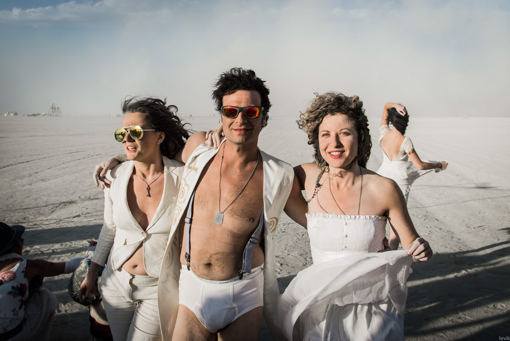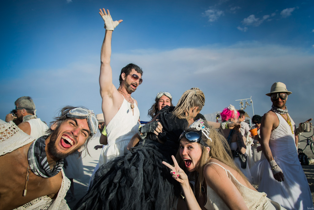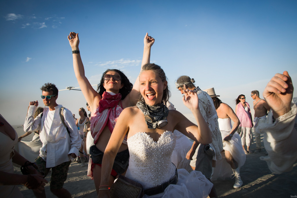Вспомнив, что многие считают дурным тоном надевать на чужую свадьбу белую одежду, мы попросили наших гостей соблюсти обычай Бёрнинг Мэна, и приготовить к церемонии белые наряды.