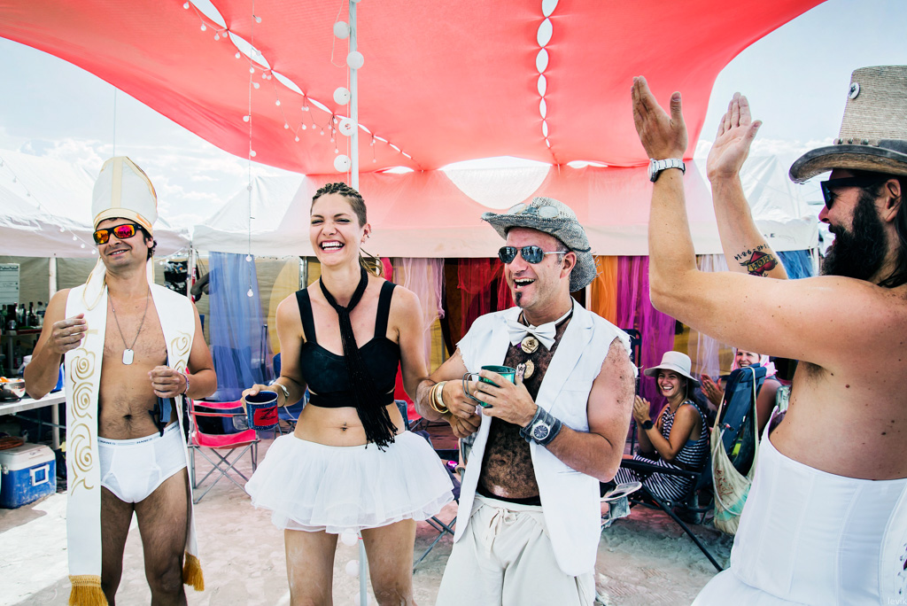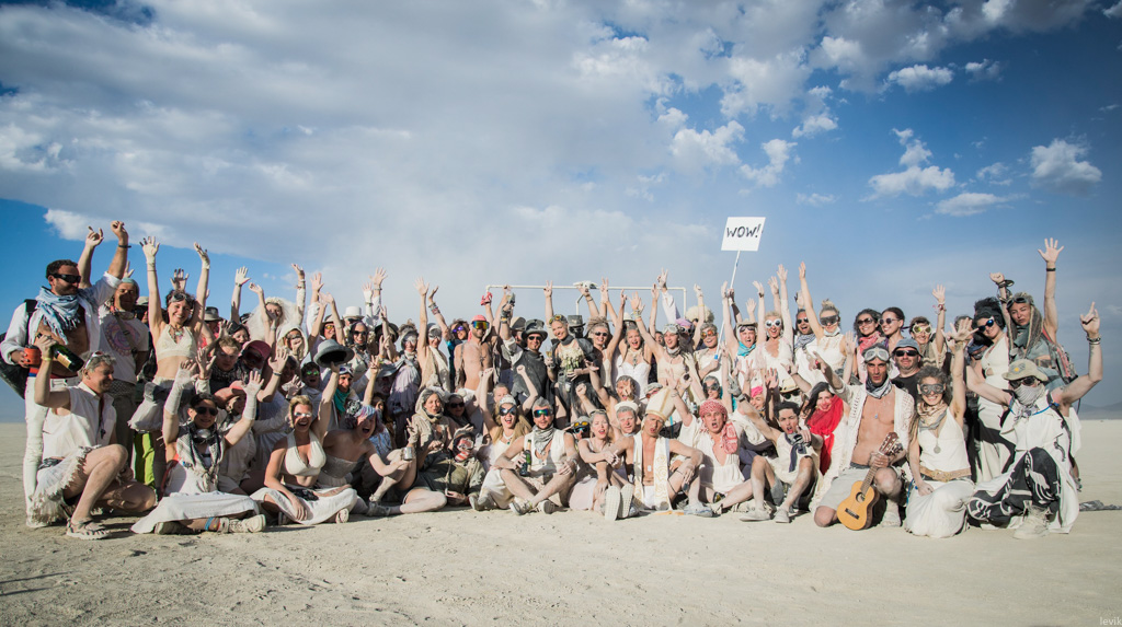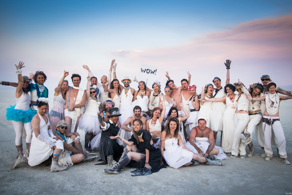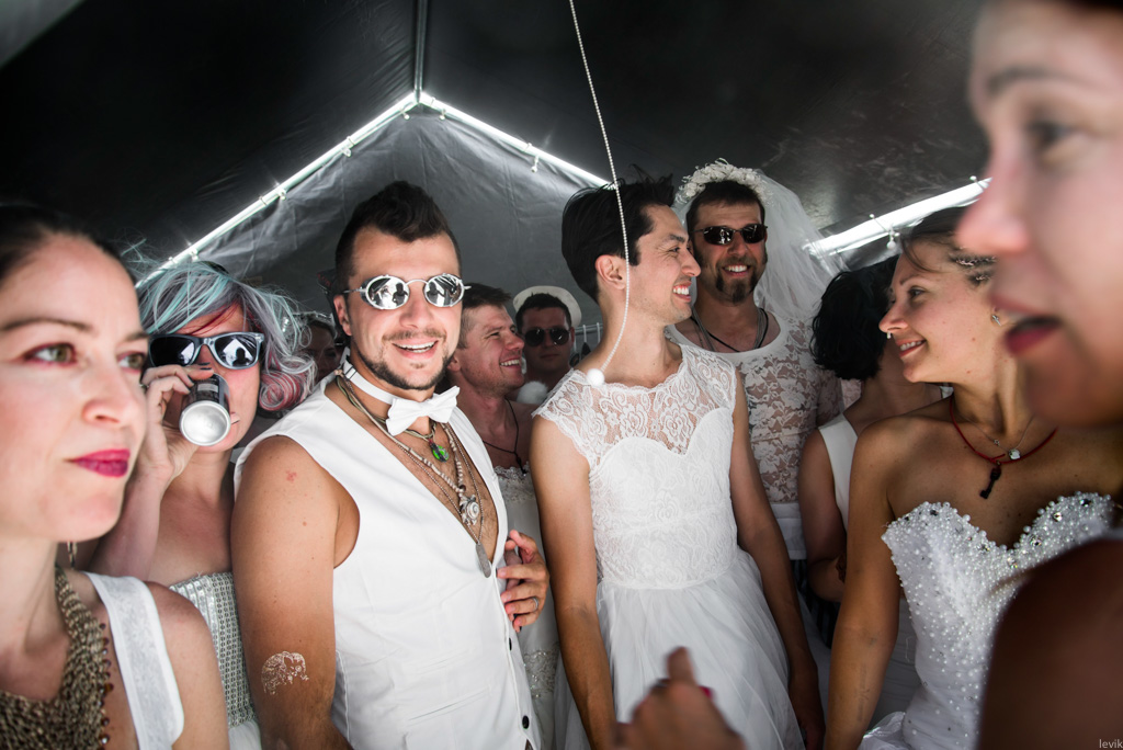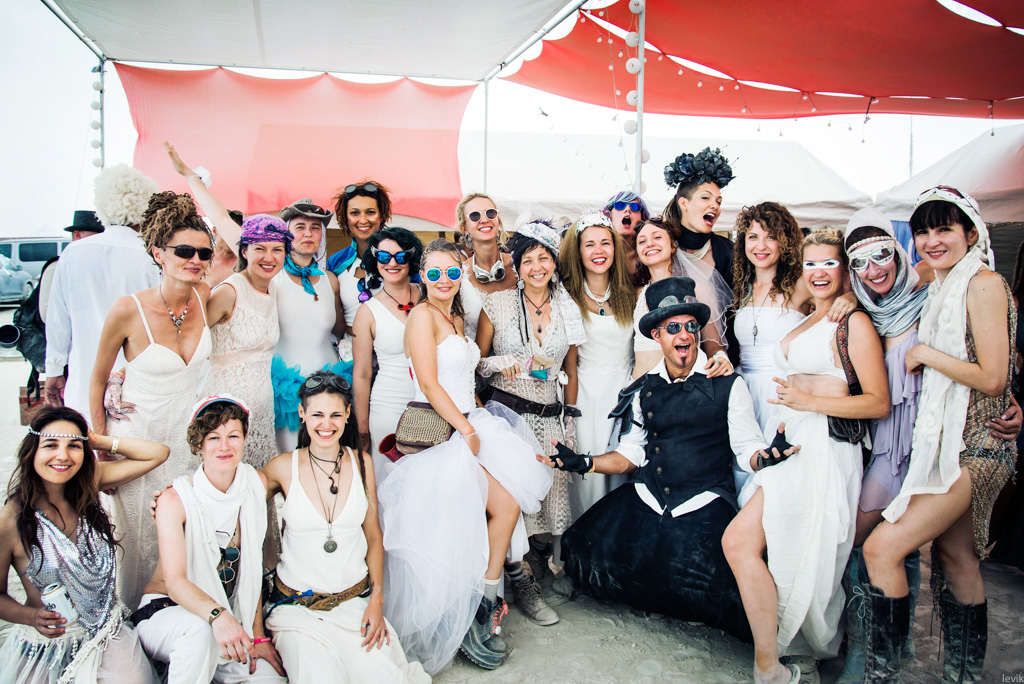 Вспомнив, что многие считают дурным тоном надевать на чужую свадьбу белую одежду, мы попросили наших гостей соблюсти обычай Бёрнинг Мэна, и приготовить к церемонии белые наряды.