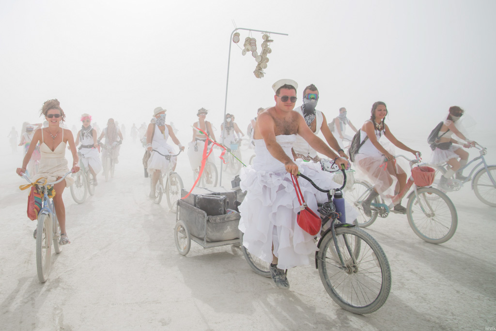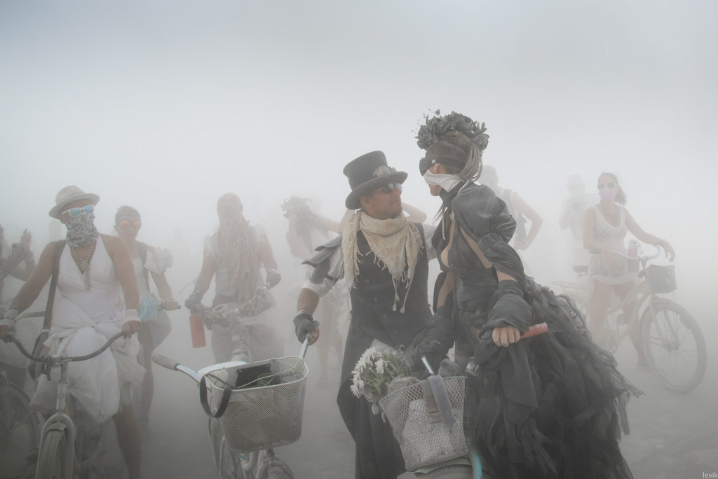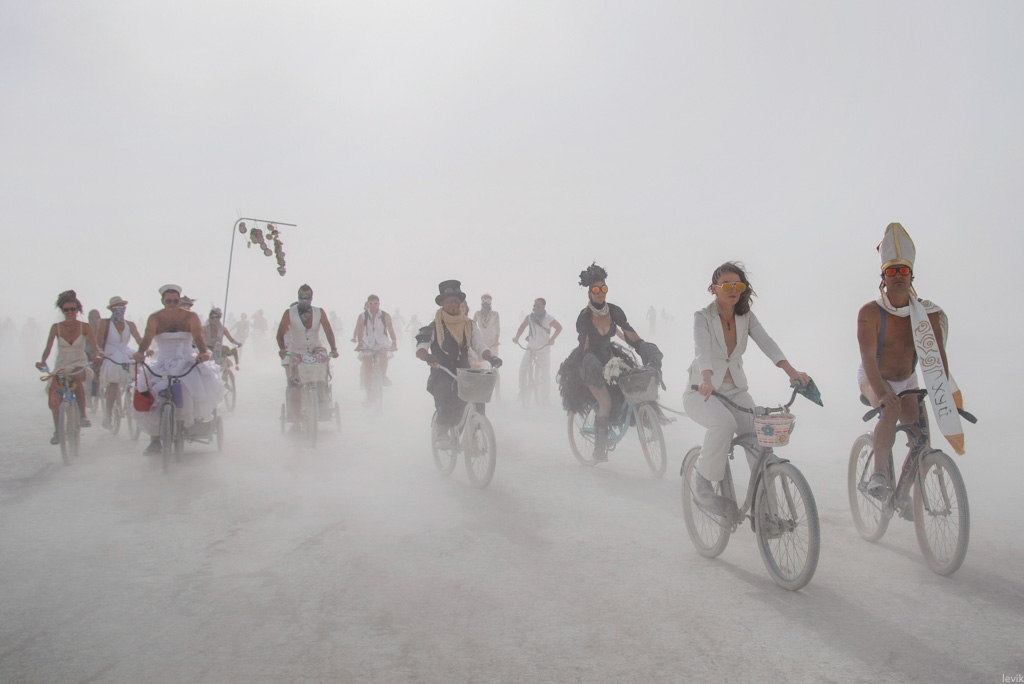 23. И тут случилось что-то волшебное. Как часто бывает на Бёрнинг Мэне, совершенно ниоткуда поднялась пыльная буря. Голубое небо затянулось белой дымкой, а видимость резко упала. Наша процессия стала похожа на кадры из "Безумного Макса", только в белых платьях. Люди растворялись в дымке, было видно только 3-4 ряда велосипедистов.