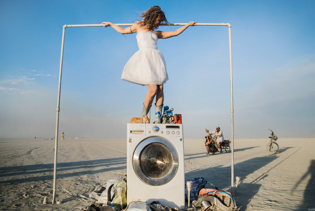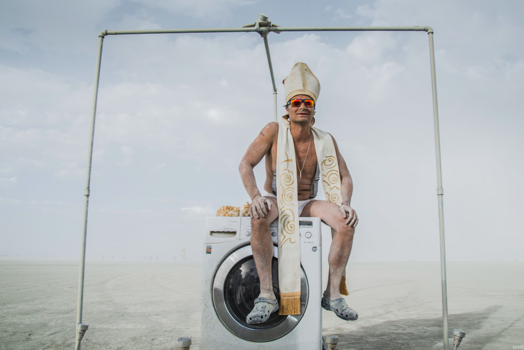 27. Кстати, насчёт стиральной машины это не шутка! В 2017 году Яша решил привезти в пустыню необычный арт-объект: стиральную машину, которую выставил посреди открытого пространства. До ближайших инсталляций было несколько сот метров. Внутри барабана стиралки лежал зловещий череп, а сверху мирно посапывал котёнок. (Попросите как-нибудь Яшу самому вам подробней рассказать об этой инсталляции, заодно мы все узнаем, что же именно он пытался этим всем сказать.) Мы же с Тоней решили использовать этот объект в качестве свадебного алтаря. По-моему он очень даже подходит!