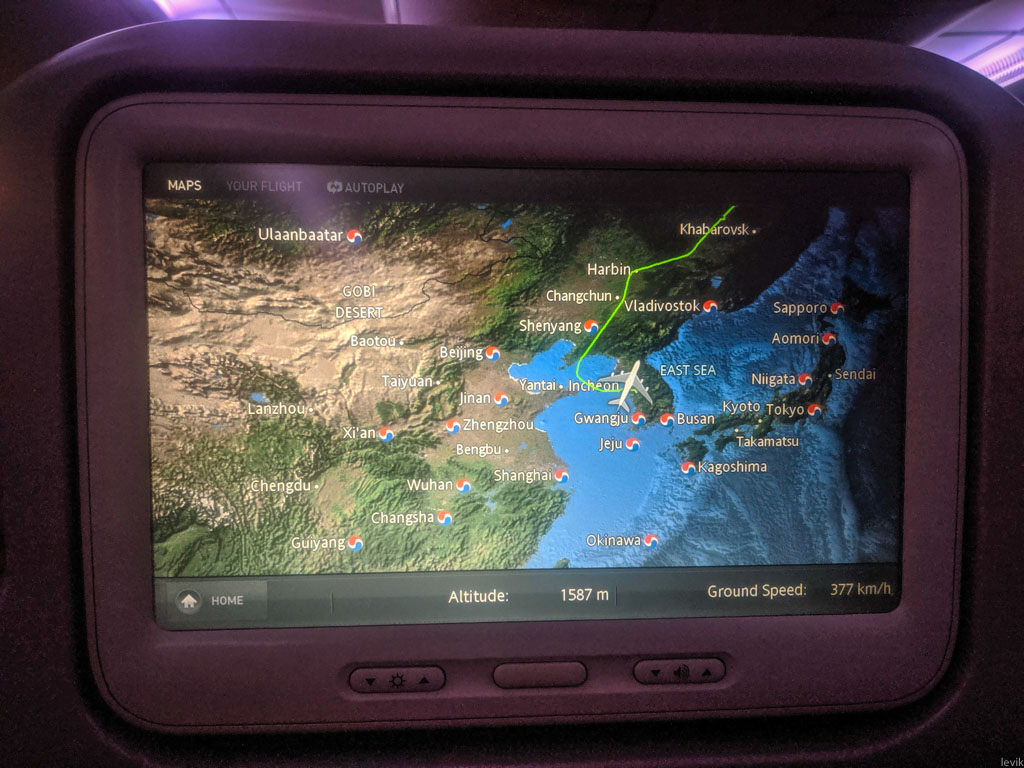 Просыпаюсь, а мы уже почти к Сеулу подлетели! Обратил внимание на то, какой крюк надо делать, чтоб не летать над территорией Северной Кореи. Интересно, её все так облетают? Например, какой-нибудь Аэрофлот, или China Eastern могут в северокорейском небе летать? Там же нормальные вроде отношения...