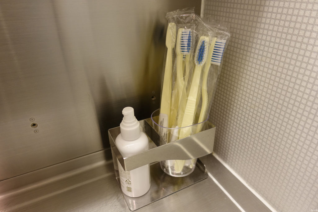 13. После еды я решил немного прогуляться. Правда, пассажирам эконома гулять не так много куда можно, но всё равно, стоит размяться перед сном. Начал я с санузла. Там всё как обычно, только заметил, что есть одноразовые зубные щётки. Мелочь, а приятно.