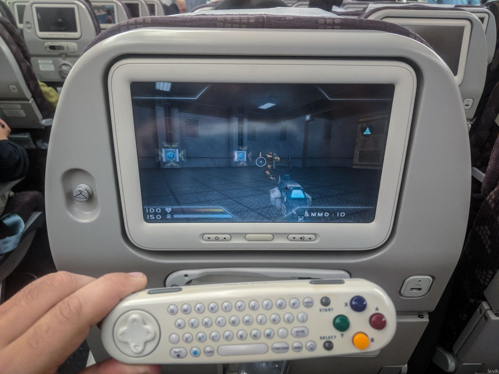 20. Погуляв таким образом до конца самолёта и назад, я решил ещё часок-другой потупить перед сном. Ведь отправляясь в другой часовой пояс важно сразу начинать спать по новому времени. Посмотрел не помню уже какое кино... И даже в игру поиграл. Никогда не понимал, почему в этих самолётных системах такие ужасные игры. Вот, например: графика уровня 1997 года. Какой-нибудь там первый Quake.