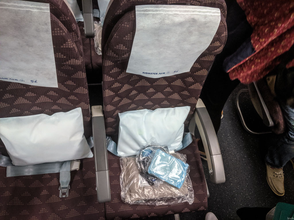 25. Надо сказать, что тут мне повезло значительно больше чем на предыдущем рейсе. Я ещё в Нью Йорке спросил, нет ли "пустых" рядов по три места, да ещё и у окна. Мне как раз такое дали, предупредив, что пока я буду лететь в Сеул, возможно мне кого-то подсадят. Но не подсадили, а значит, у меня было в личном пользовании все три сидения.