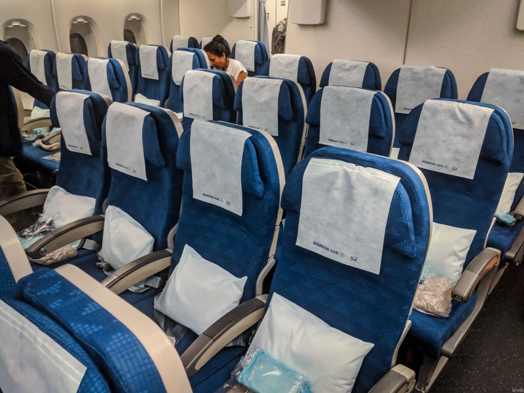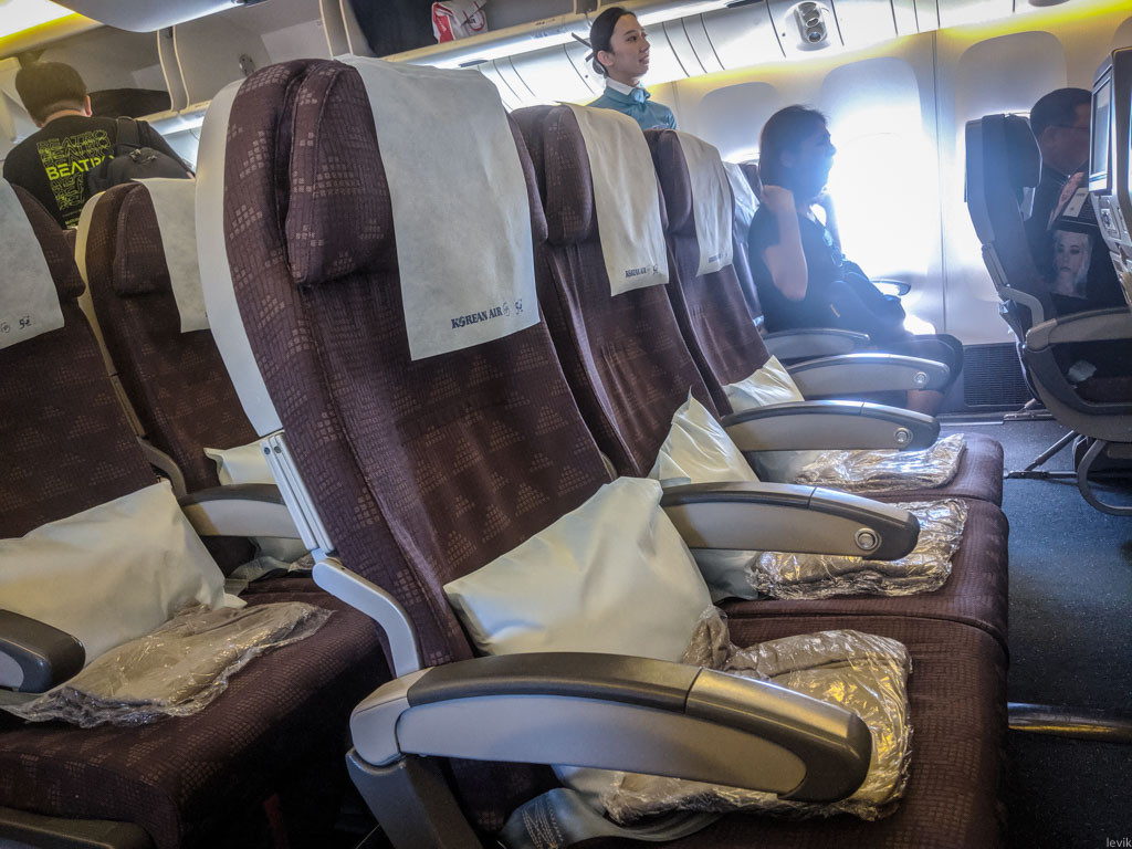 3. А моё место во втором, "коричневом" отсеке. Korean Air партнёр Дельты, и мой статус позволил мне зайти на борт одним из первых пассажиров эконома, чтоб успеть поснимать ещё более-менее пустой салон.