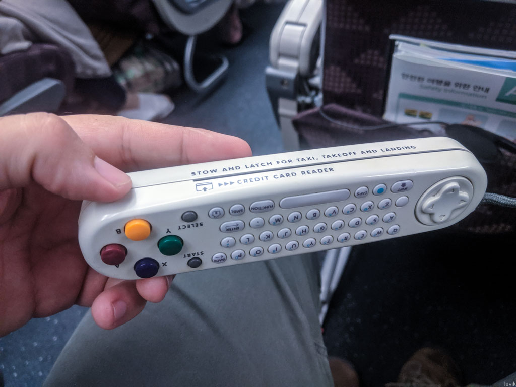 21. Кстати, во всех старых пультах есть считыватель для кредитной карты. Но только с магнитной полосой. Раньше думали, что авиакомпании смогут много разной фигни пассажиру прямо на месте продавать - от платных фильмов до еды/спиртного и дьюти-фри. Но у корейцев ничего не продаётся. А считыватель есть.
