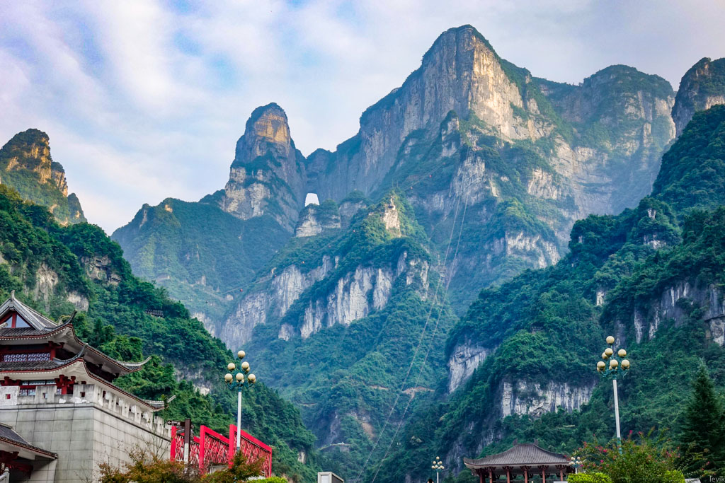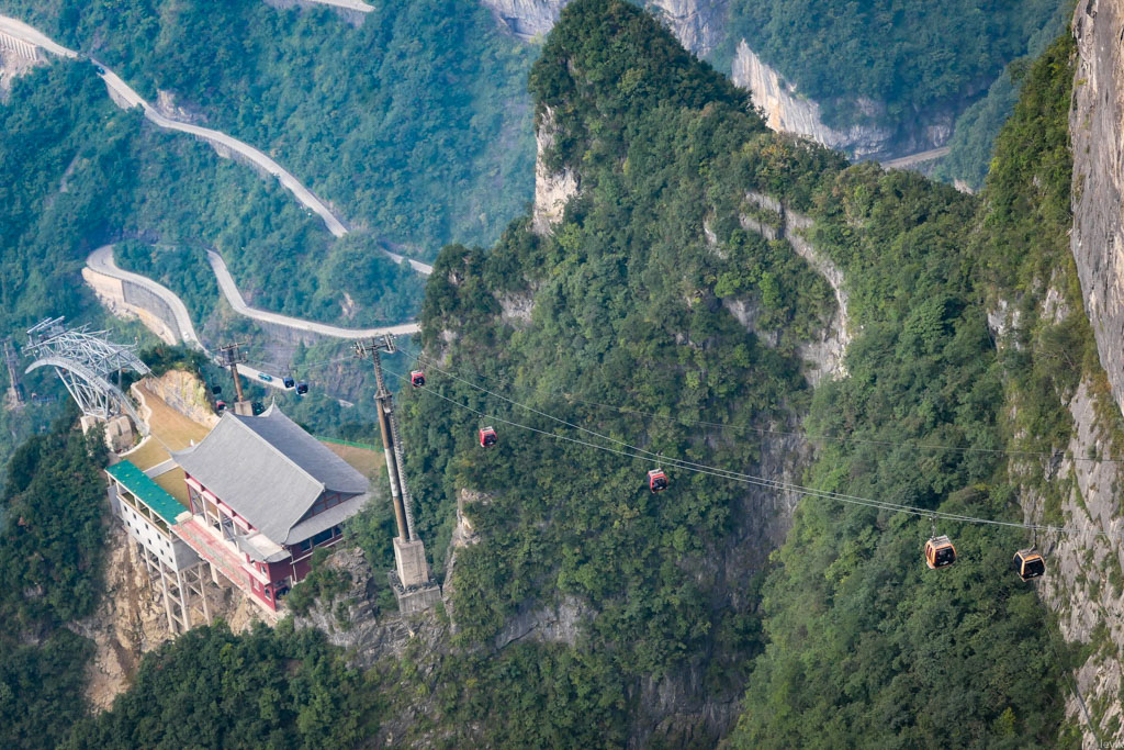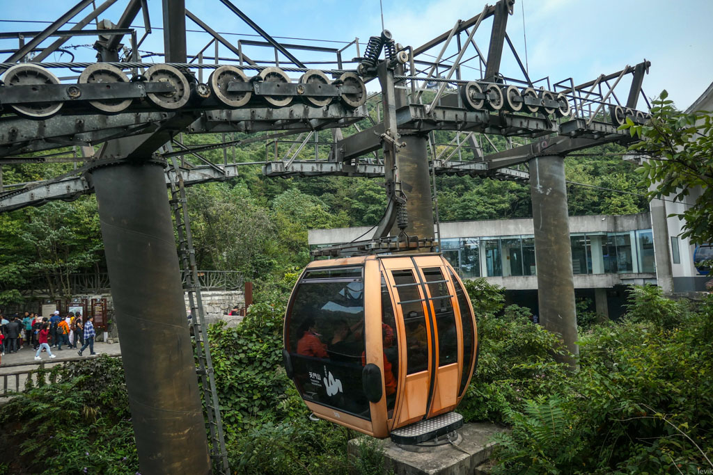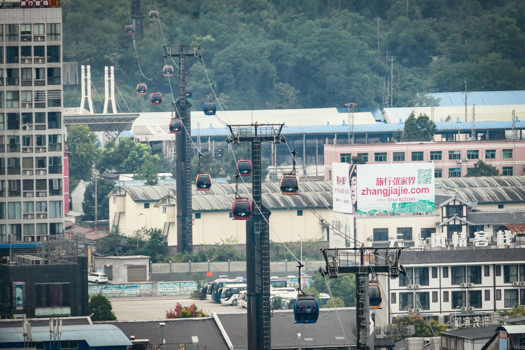 Если вы приглядитесь к этой фотографии поближе, то увидите, как в гору идут две еле заметные нити. Это тросы канатной дороги, которая ведёт на гору из близлежащего города с красивым названием Чжанцзяцзе. (Без преувеличений скажу, что произношение этого имени я репетировал три месяца, с тех пор как взял билеты в эту поездку.)