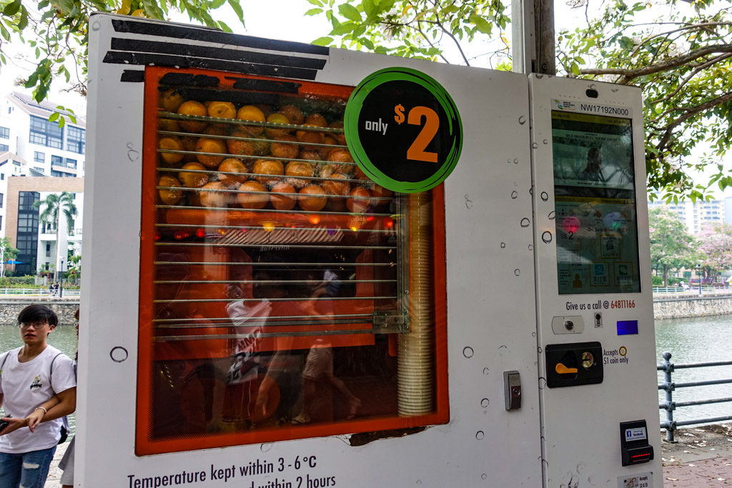 20. Автомат по продаже свеже-выжатого апельсинового сока. Цена вопроса, два "сингаря" (это где-то $1.30 в нормальных деньгах). Машинка сама выжмет тебе чашечку сока, а ты за эти деньги ещё и сможешь наблюдать за процессом.
