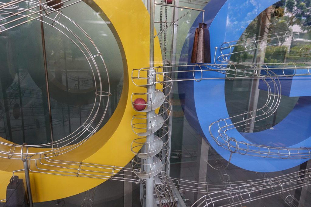 42. Всего в этой штуке где-то дюжина шаров, и если все "раскрутить", то инсталляция оживает, и вокруг каждой из букв логотипа катятся увесистые шарики.