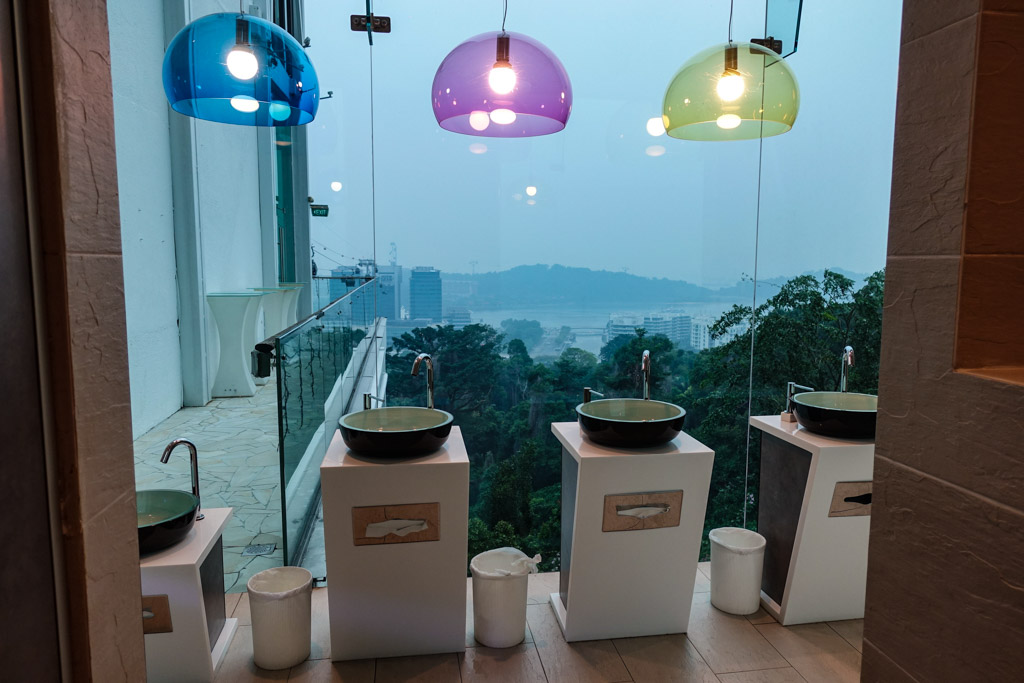 35. Туалет с видом на горе Фабер (где начинается канатная дорога на Сентозу). Я бы на их месте сделал писсуары с таким видом, но они решили только умывальники у окна расположить.