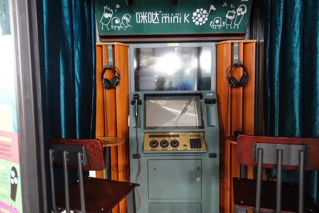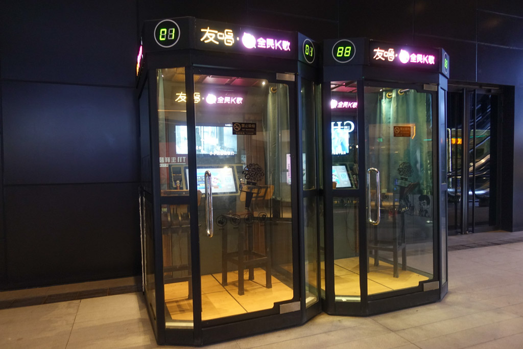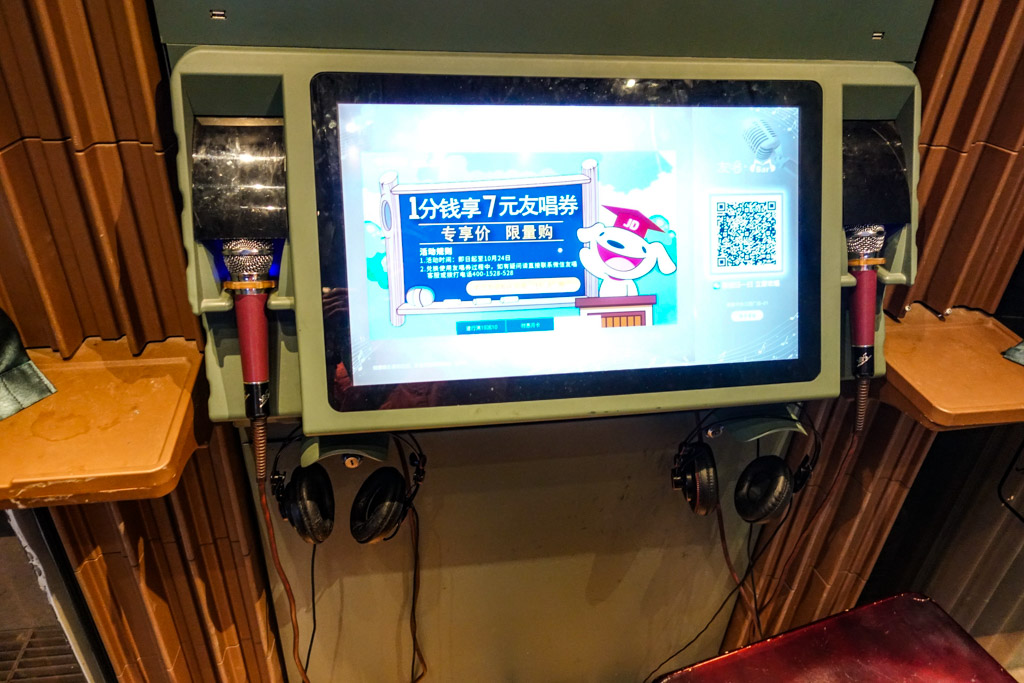 Оказывается, это небольшая комнатка на двоих для пения караоке! "Мини К". Внутри два стула, экран для выбора песен, два микрофона и две пары наушников. Платишь денежку, и машинка заводится.