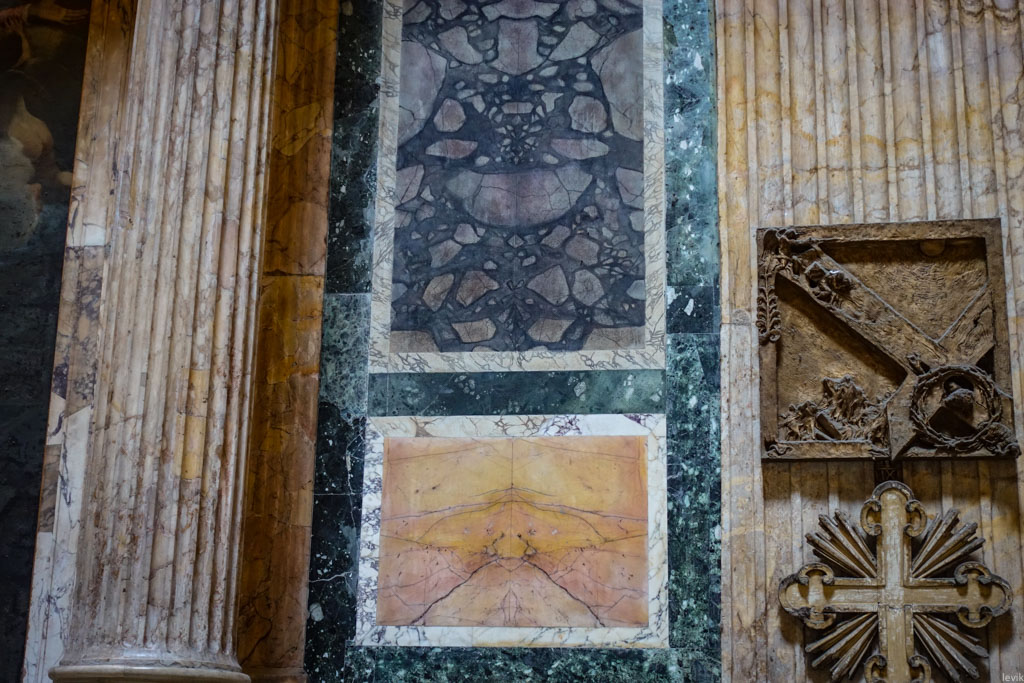 Внутренности купола покрыты прямоугольными нишами-кессонами, а все интерьеры ниже покрыты мраморными плитами.