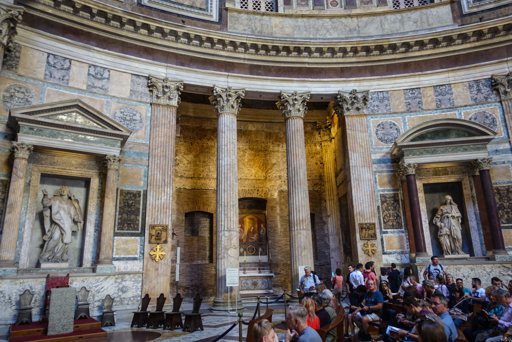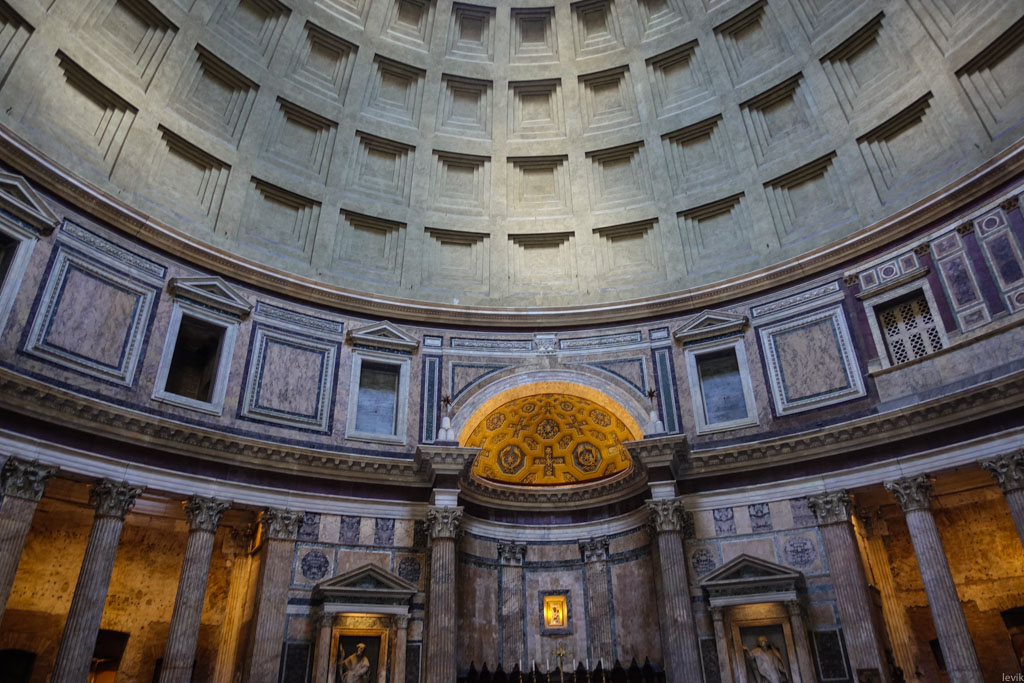 Древнеримское здание Пантеона довольно уникально. Построенный в 126 году храм всех богов (именно так переводится его название) на протяжении 1300 лет мог похвастаться самым крупным куполом в мире. Этот купол уникален своим 9-метровым отверстием в центре. Прослужив почти 500 лет в качестве языческого храма, Пантеон был превращён в христианскую церковь.