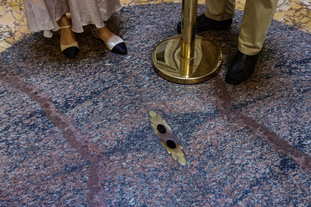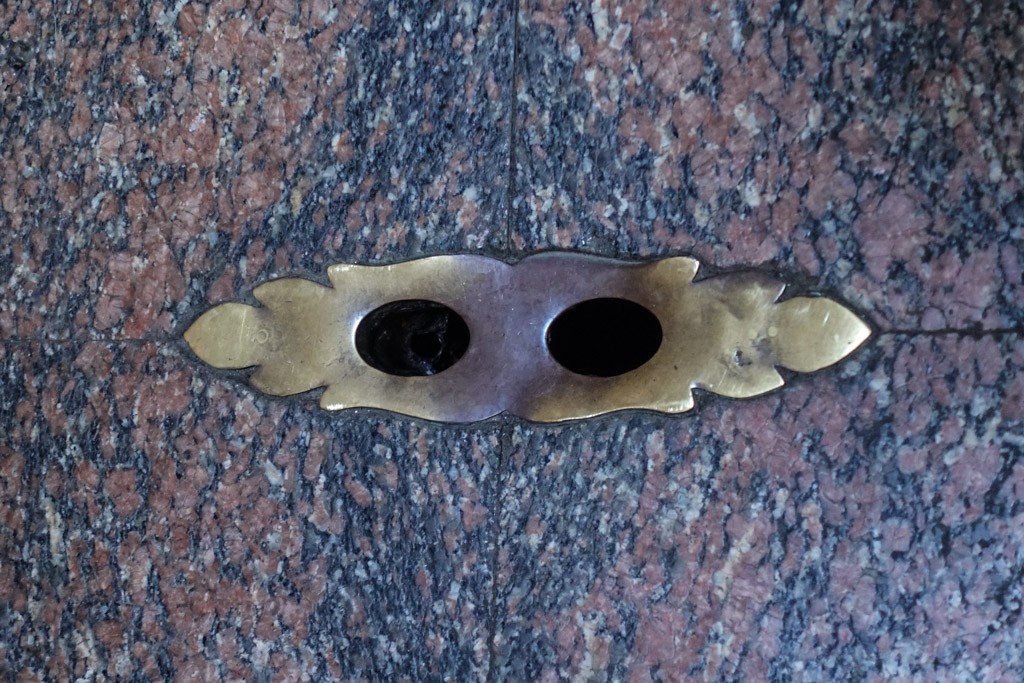 Моё внимание привлёк пол в центре этого зала: тут я заметил небольшую медную пластину с двумя дырочками.