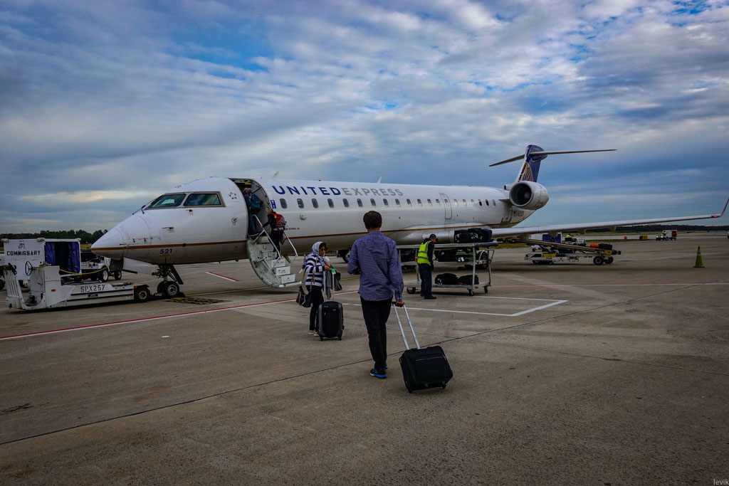 Мой перелёт был с пересадкой в Вашингтоне, и там то и оказалось, что второй мой рейс обслуживает не сама United, а некая несуществующая авиалиния "United Express" - именно её самолёт мы видим на заглавной фотографии.