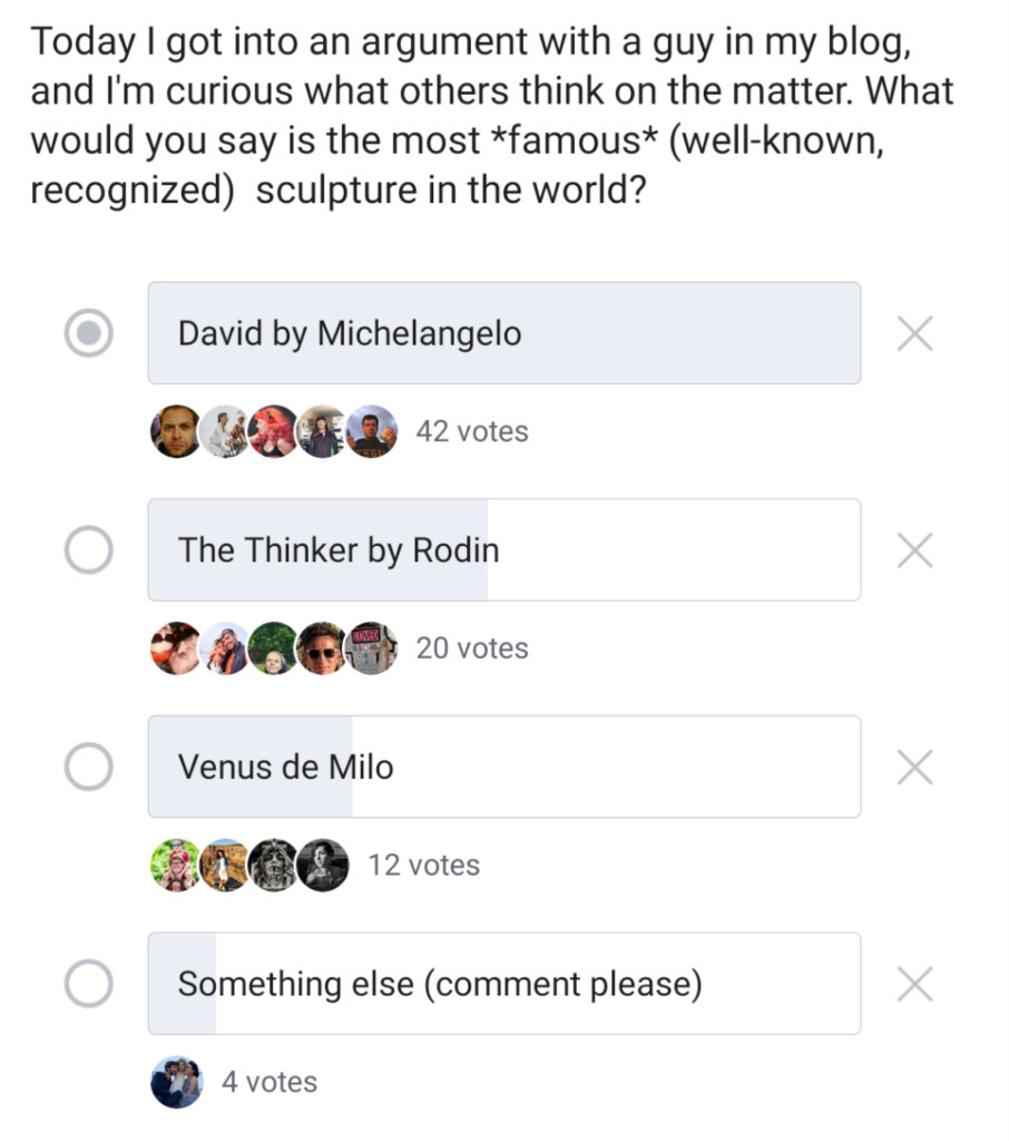 А получается, мнение человека о том, какая скульптура самая знаменитая зависит от его места жительства? Это очень неожиданный поворот. Я долго думал, чем это может быть вызвано, пока один из Фейсбучных комментаторов не подсказал мне один вариант ответа: