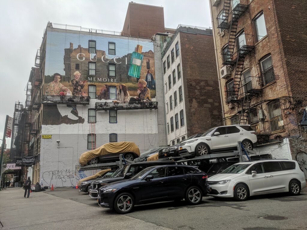 16. Редкий в этих краях пустырь сейчас временно занят парковкой. А чтоб влезало больше машин, здесь установили гидравлические подъёмники.