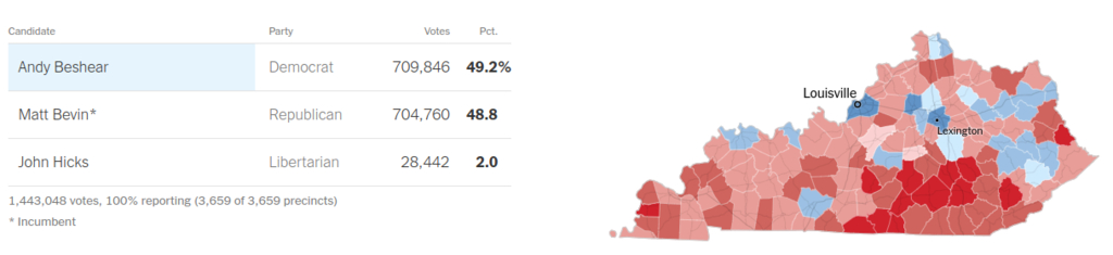 И вот, когда пришли подсчёты с участков в Луивилле и Лексингтоне, оказалось, что демократ Бешир вырвался вперёд. В какой-то момент он опережал республиканца на 30,000 голосов. Однако с поступлением результатов от участков в глубинке, этот разрыв стал сокращаться. И до самого конца было неясно, хватит ли Бевину "деревенских" избирателей, чтоб настигнуть оппонента. Однако к 11 вечера все участки отчитались, и результат был неутешительным для республиканцев и Трампа: