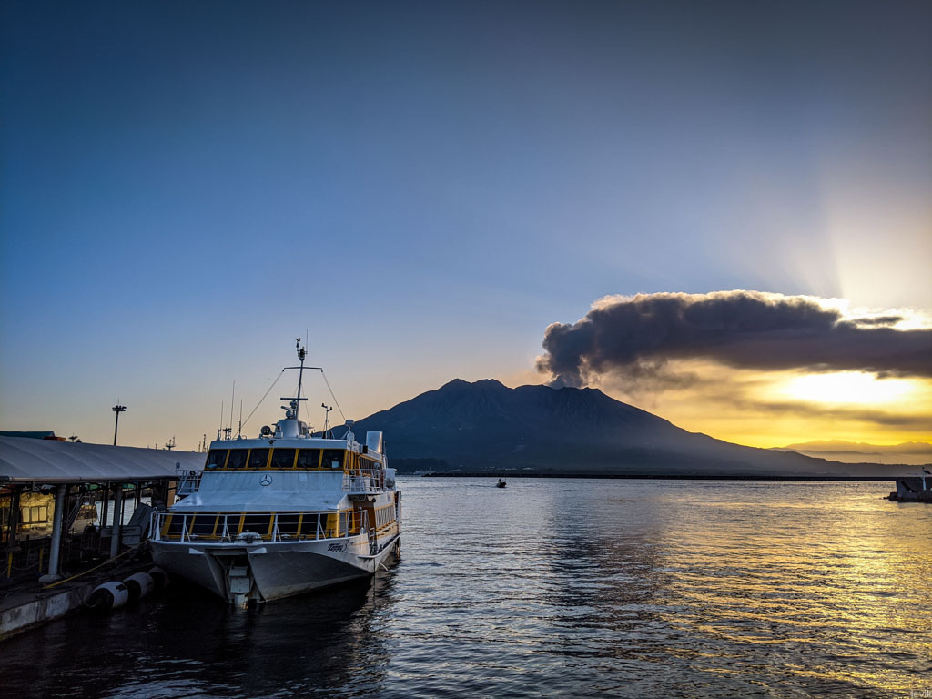 4. Дойдя до порта, я увидел удивительную картину: дымящая Сакурадзима силуэтом выделялась на фоне только что взошедшего солнца. А ближе, у причала, стоял наш паром.