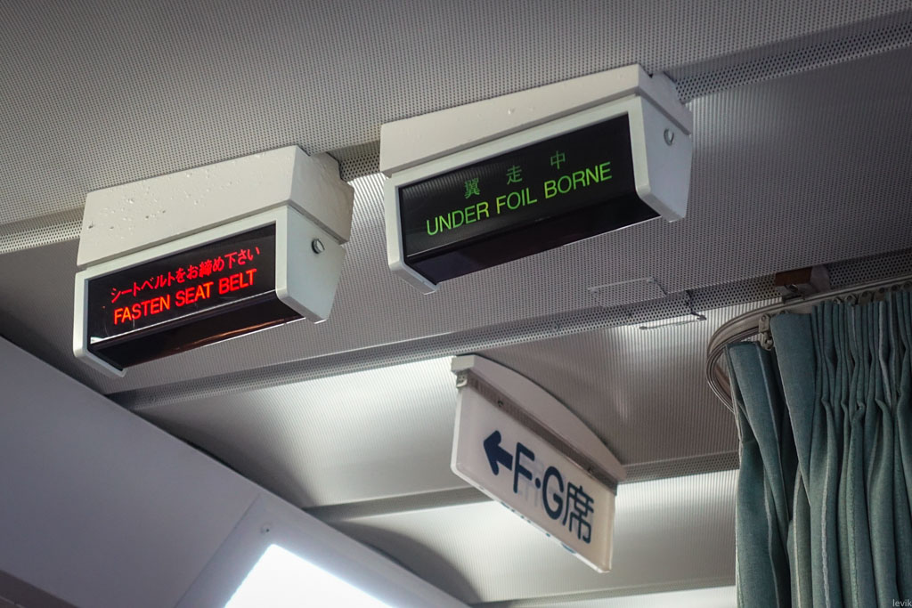 15. Мы разгоняемся, и под потолком загорается плафон, указывающий, что судно идёт навоздушной подушке подводных крыльях (Лёва болван!) К счастью, на море штиль, и наше судно практически не качает.