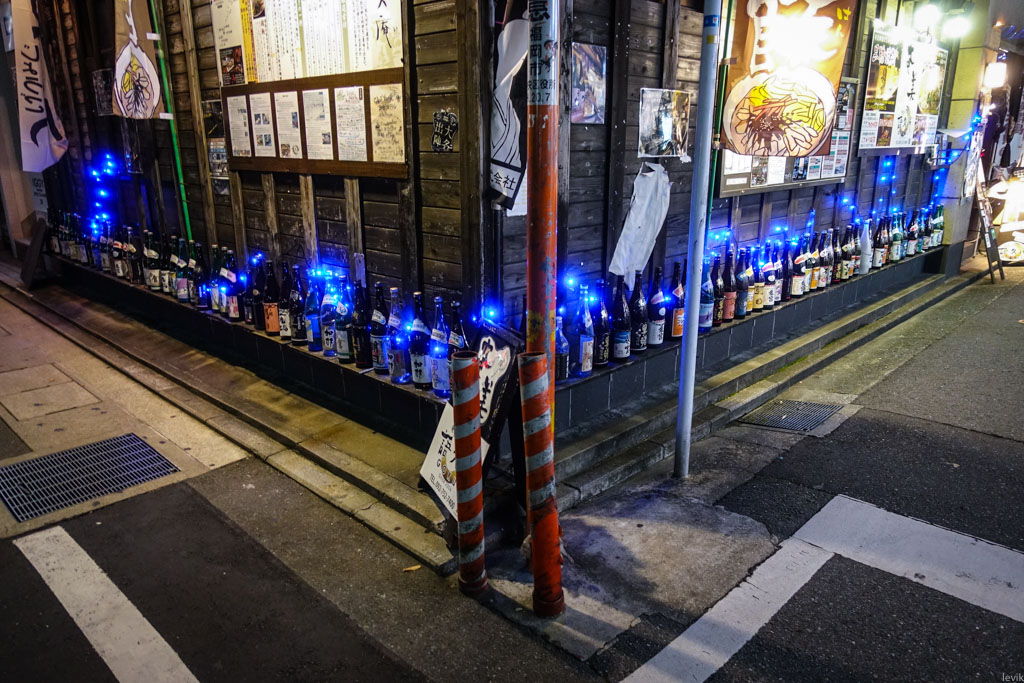 13. После ужина в трактире, нас повели дальше пить саке. Посмотрите, какой магазин - весь обставлен бутылками. Они, кстати, пристёгнуты к стенам здания цепочками. И при этом они пустые! Думаю, пристегнули их для того, чтоб не упали ненароком. Но вообще выглядит красиво.