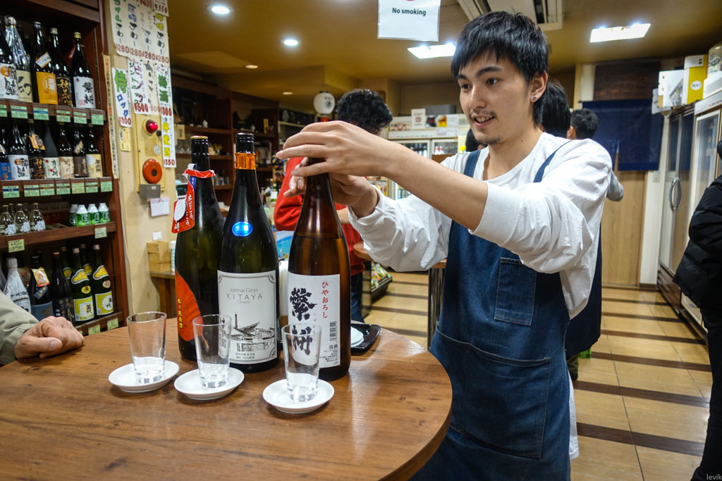 15. К счастью, вовсе не обязательно покупать целую бутылку. Можно устроить дегустацию. Мы попросили три наименования, которые производятся прямо здесь в Фукуоке.