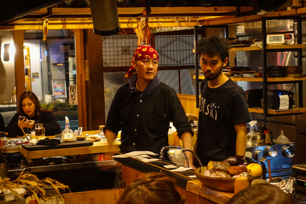 8. Кухня открытая, мужик в пиратской красной бандане заправляет всем. На самом деле такая повязка - тоже традиция японских поваров.