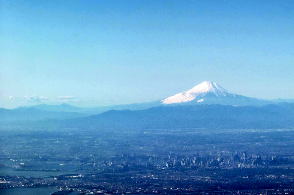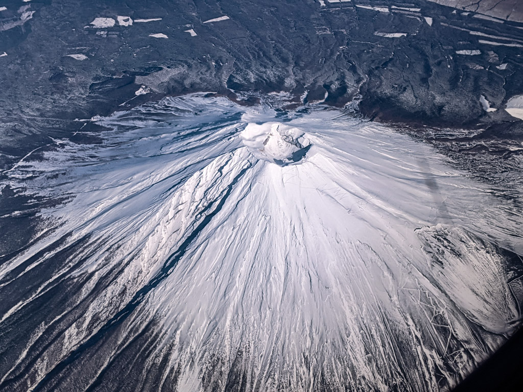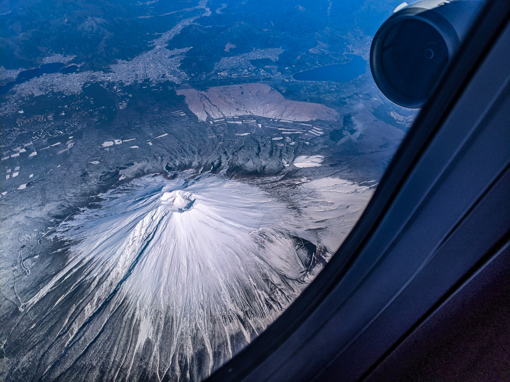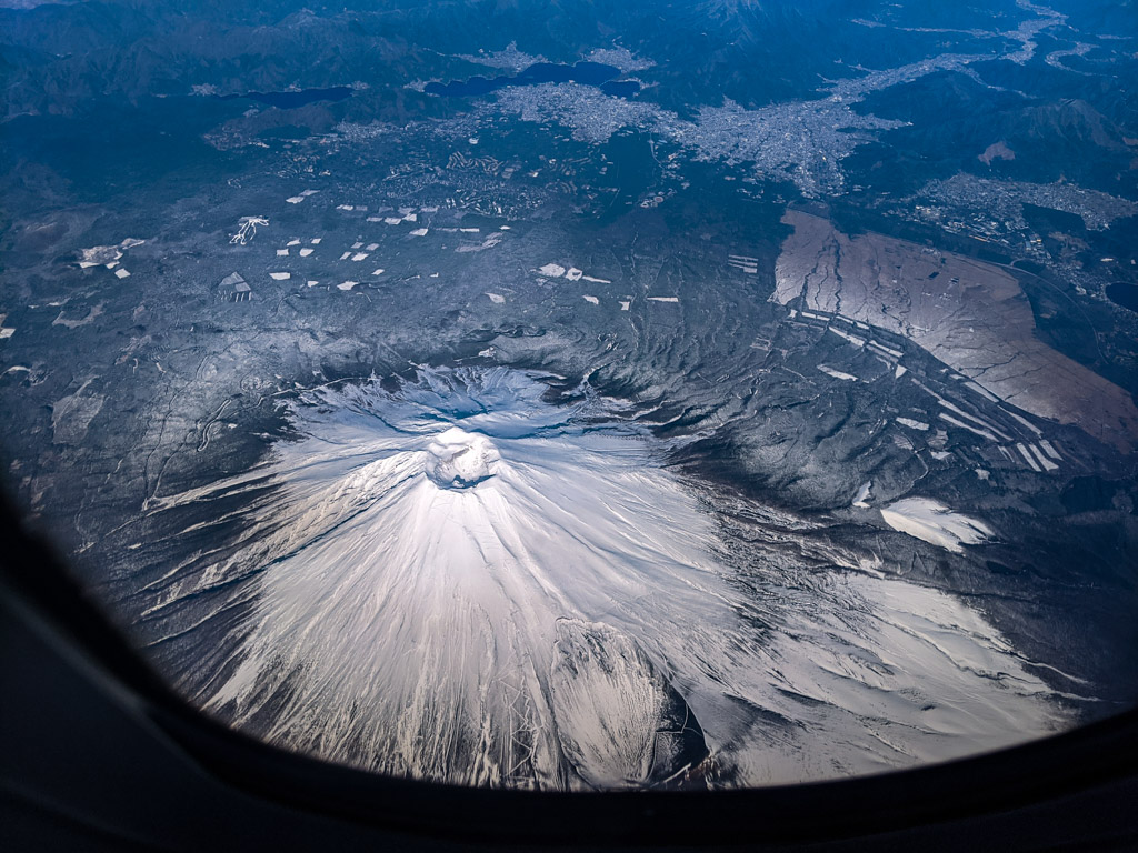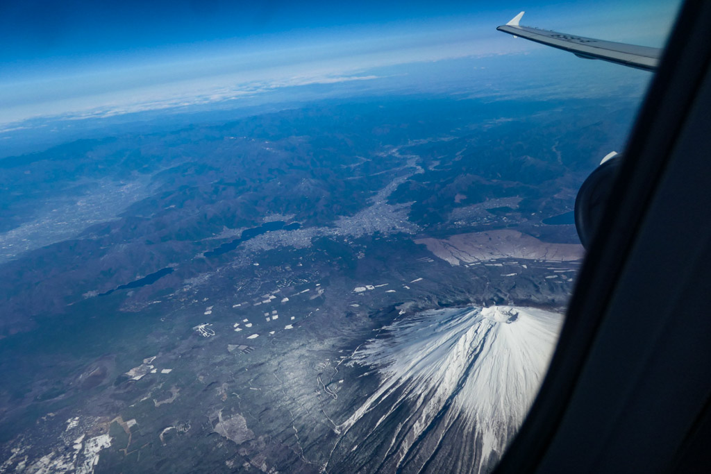 Финальной вишенкой на торте великолепной поездки в Японию стал невероятный вид горы Фудзи под крылом самолёта, уносившего меня из Токио. Это было абсолютно неожиданно, и очень красиво: абсолютно случайно взглянуть ещё один раз на уходящий вдаль город, и увидеть вместо него под крылом эту огромную белоснежную махину священного для японцев вулкана.
