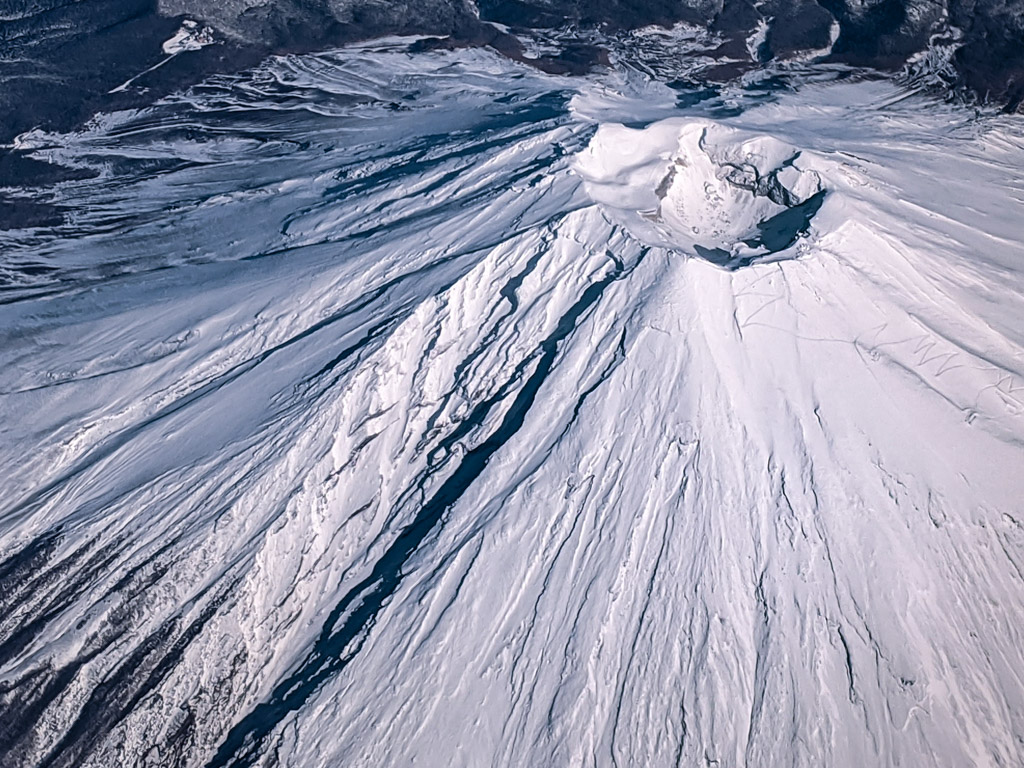 9. Трудно поверить, что три с половиной года назад я стоял на этой вершине, встречая рассвет. Сейчас, несмотря на относительно тёплую погоду японского побережья (там 10-20 градусов днём), пик Фудзи уже покрыт толстым слоем снега. И лишь если приглядеться, можно рассмотреть тропу, зигзагом идущую к самой кромке кратера.